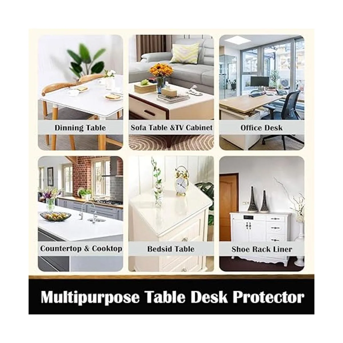 Multipurpose Plastic Table Protector Cover MatThe plastic table cover protectors are widely used in all kinds of furniture tops,such as : kitchenwooden dining room table, glass, marble,stainless steel,coffee end table,TV bench,dressing,makeup table,night stand,kitchen countertop cooktop,party table,writing desktops etc.Also use for computer desk mat,office floor chair mat,garage floor or rug protective cover mat to keep your table top,furniture topper, tablecloth