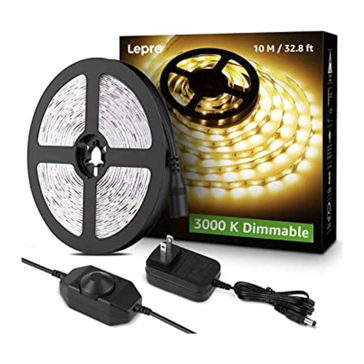 Lepro Tira de luz LED, luces de tocador regulables de 32.8 pies, 3000 K, luces de cinta LED súper brillantes, 600 LED SMD 2835, adhesivo fuerte 3M, adecuado para el hogar, cocina, debajo del gabinete, dormitorio, blanco cálido