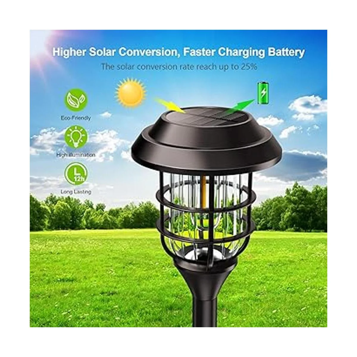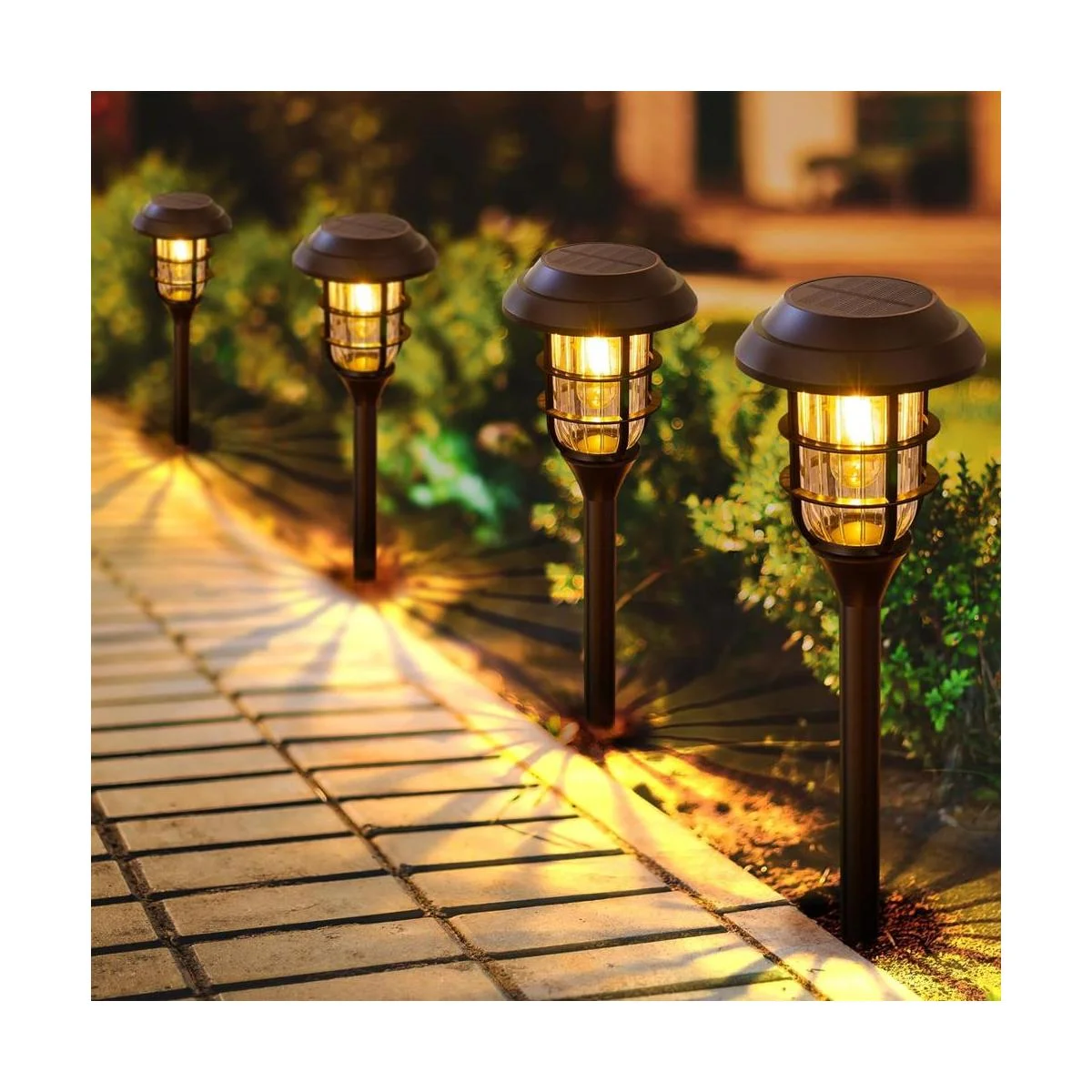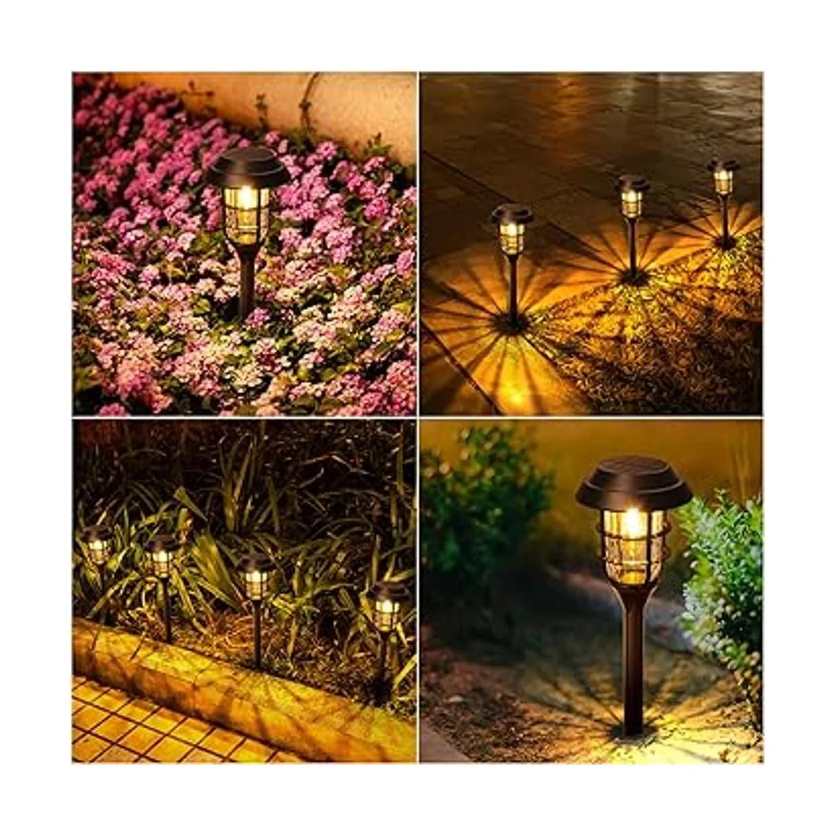 Luces solares brillantes y de larga duración: este paquete de 8 luces solares para exteriores adapta al LED de filamento mejorado, que crea un ambiente romántico y cálido y más brillante que otras luces solares. Estas luces solares de camino están equipadas con panel solar mejorado, batería recargable NiMH 600 mAh. Las luces solares de jardín pueden iluminar hasta 8 12 horas y proporcionar un brillo de iluminación claro.