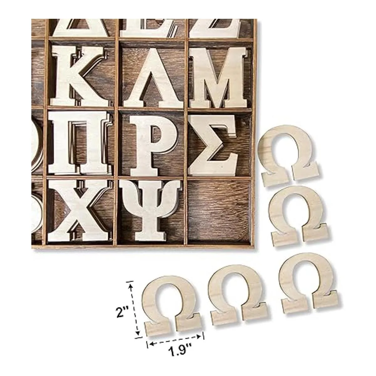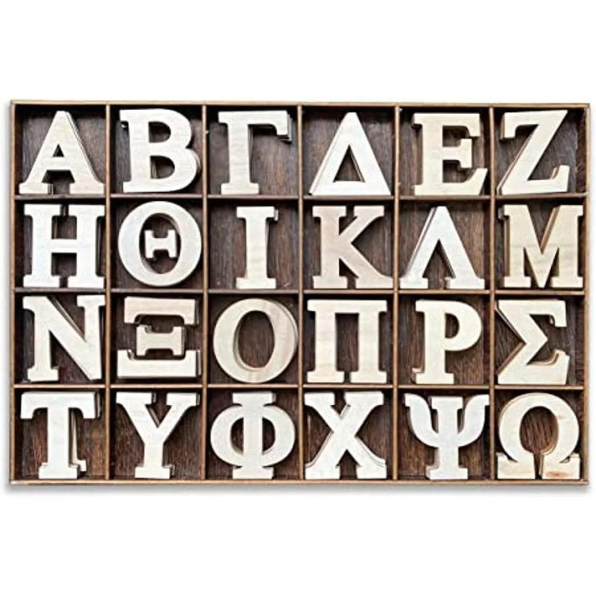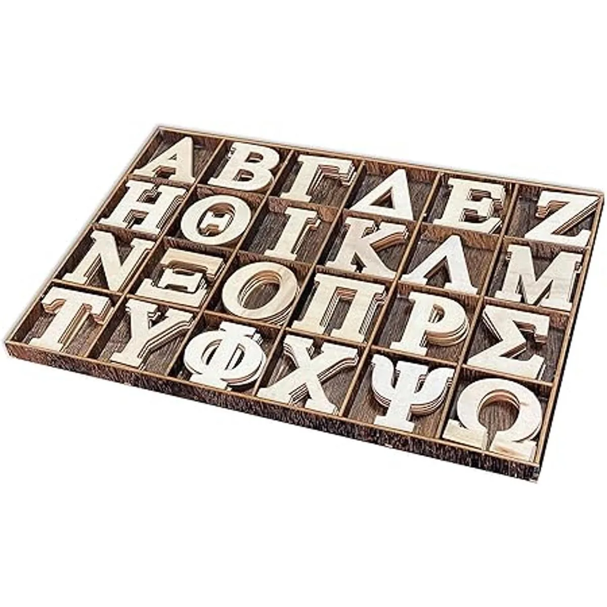 Letras griegas de madera de 2 pulgadas, 120 piezas de letra negrita de madera sin terminar alfabeto griego con bandeja rústica para adornos, hermandad, fraternidad, bricolaje, manualidades caseras