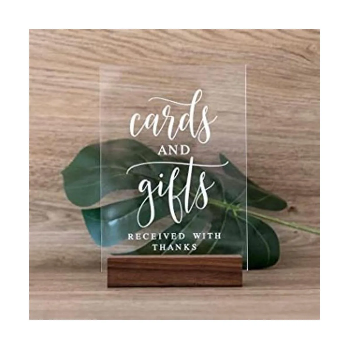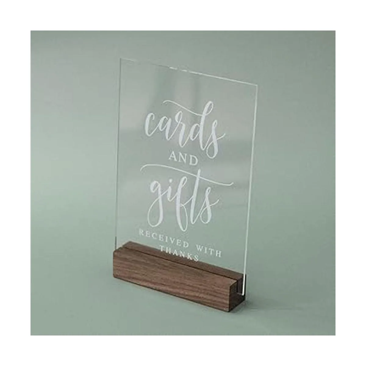Letrero de acrílico para regalos y tarjetas con soporte de madera, 5 x 7 pulgadas, letrero de acrílico transparente con soporte para decoración de mesa de boda, recepción y eventos, fiesta
