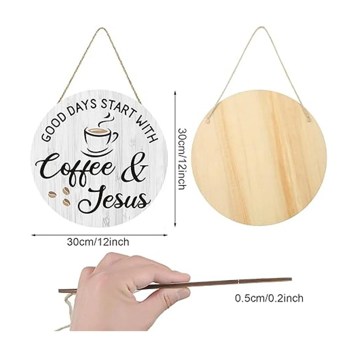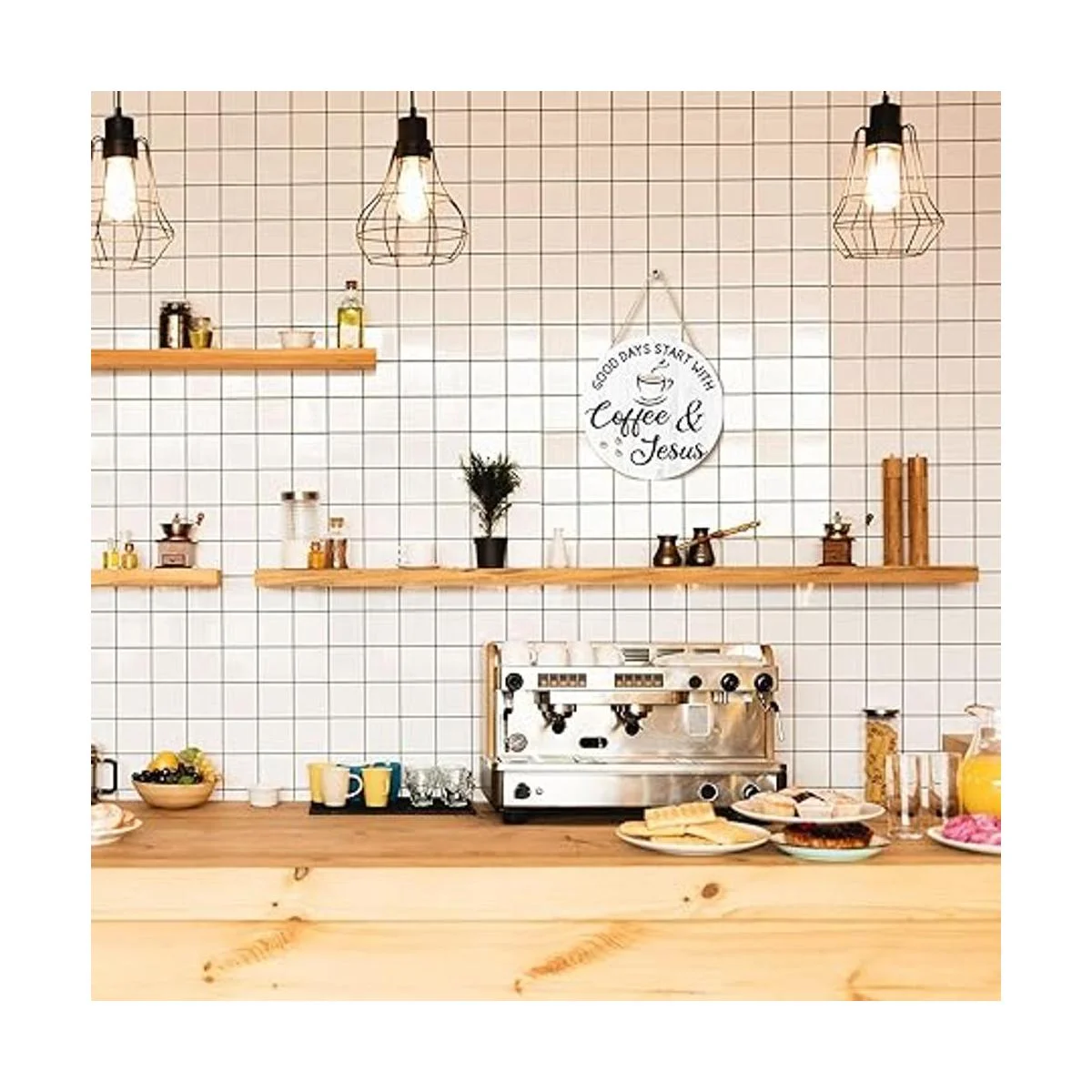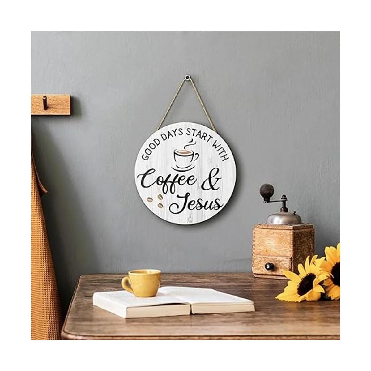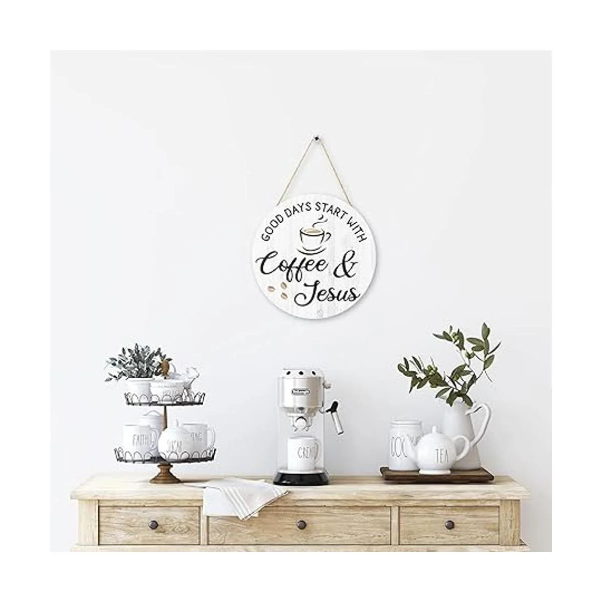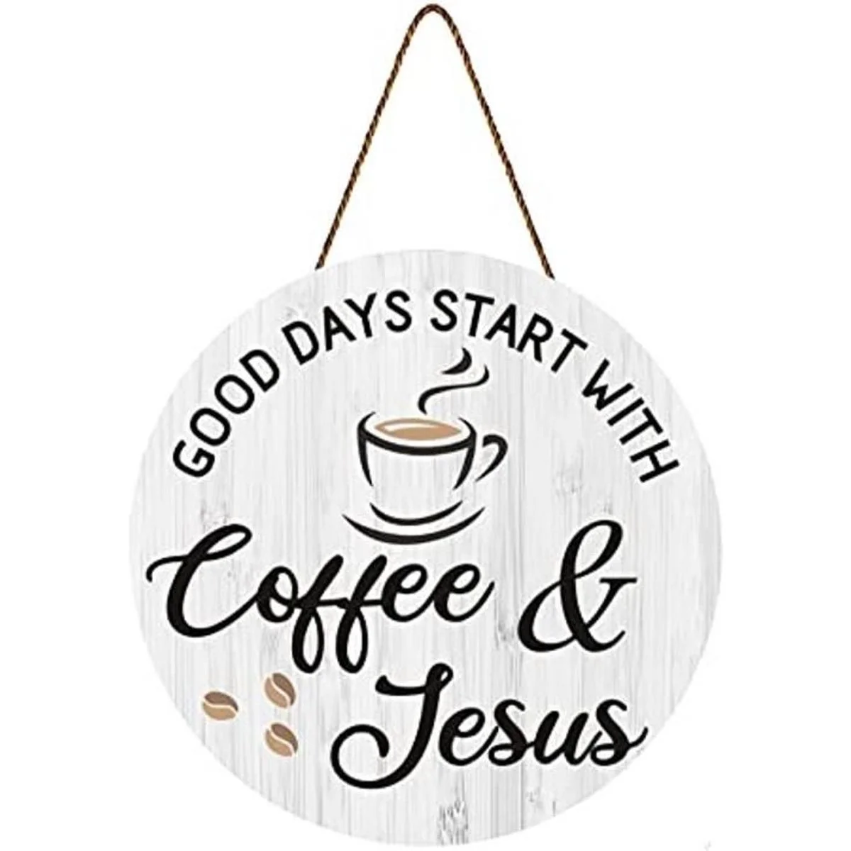 Letrero de barra de café, decoración de café, letrero de madera para colgar café, placa de café para barra de café de granja, accesorios de cocina, amante del café blanco, buenos días comienzan con café y Jesús