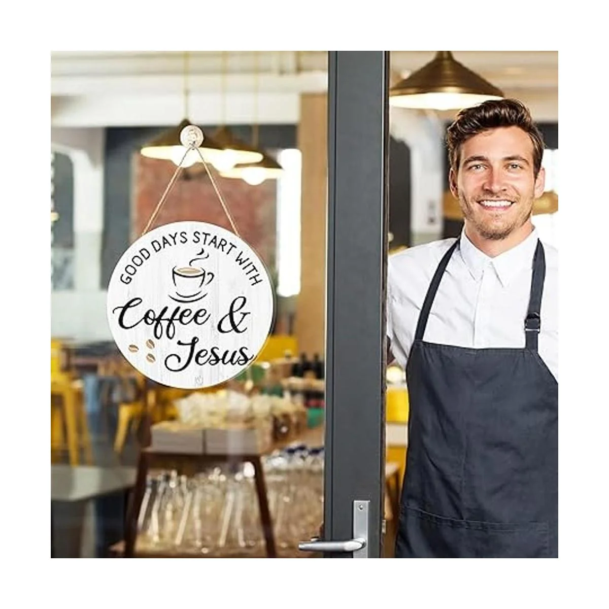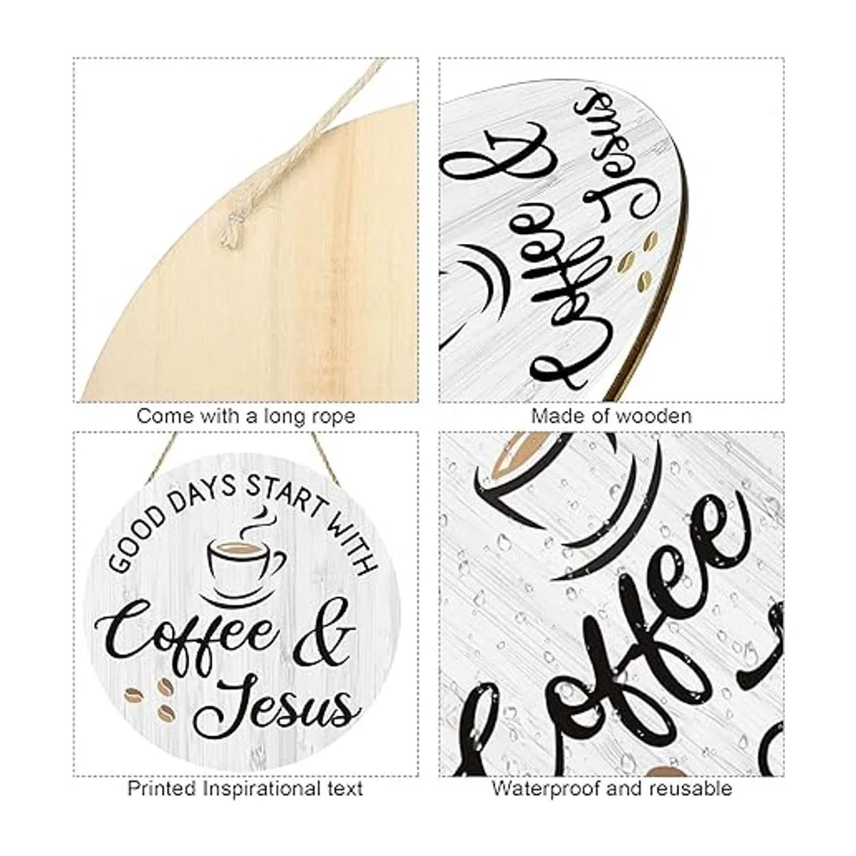 Diseño atractivo y rústico: la decoración vintage de la placa colgante de café está impresa con buenos días que comienzan con café y Jesús, y decorada con bonitos patrones vivos, incluyendo café al vapor y algunos granos de café; el diseño delicado y rústico atraerá la atención de la gente y traerá algo de diversión a tu hora del café