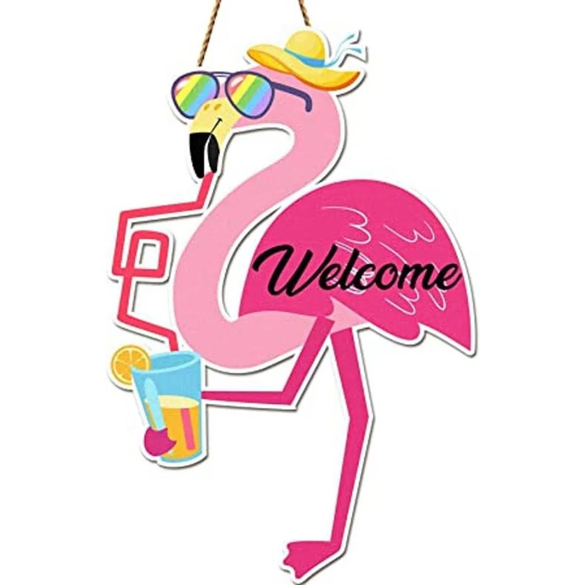Divertido letrero de flamenco: este colgador de puerta de flamenco está diseñado con un divertido flamenco que lleva una bufanda roja y un sombrero, combinado con colores brillantes y arte Bienvenida para añadir más diversión y relajación a tu hogar de verano