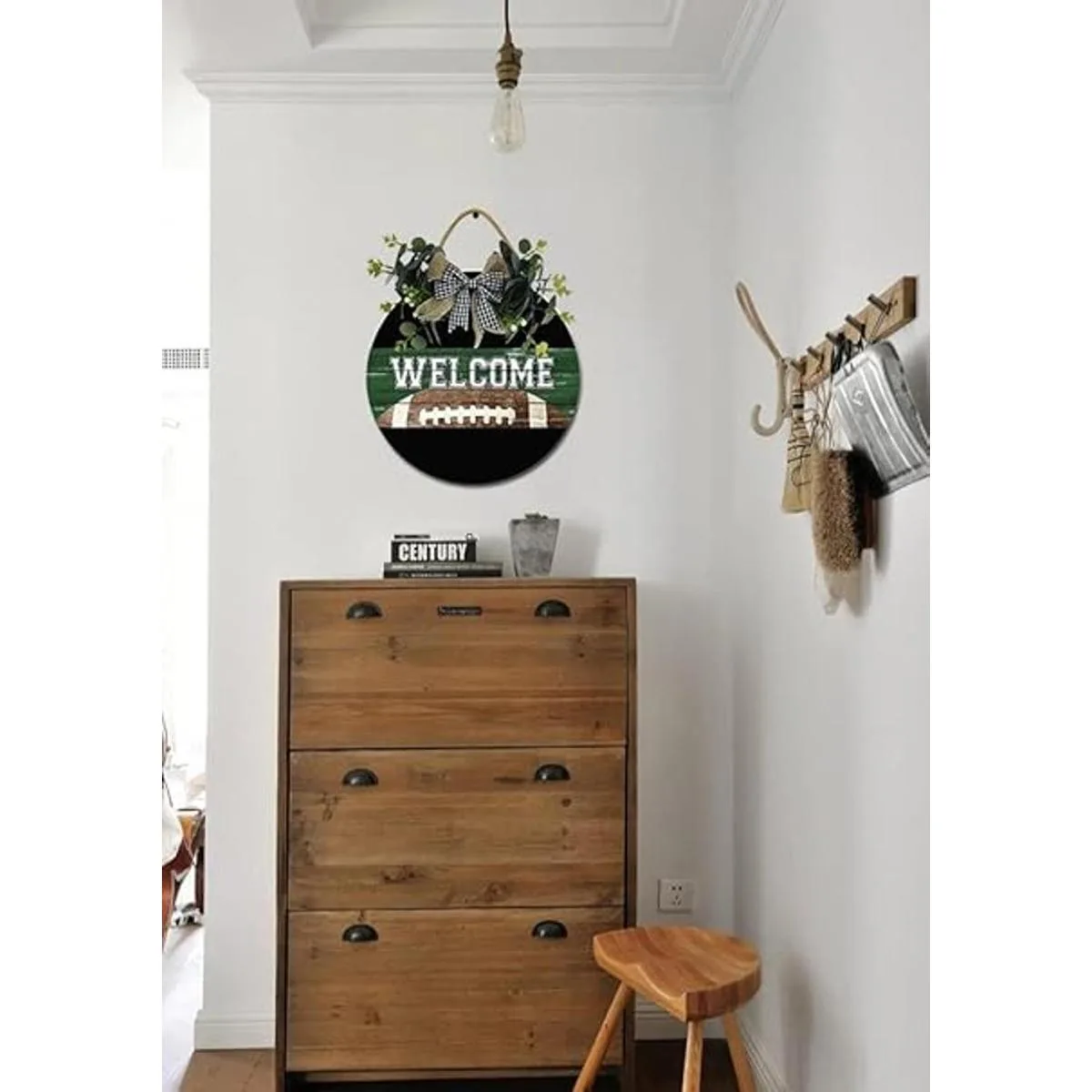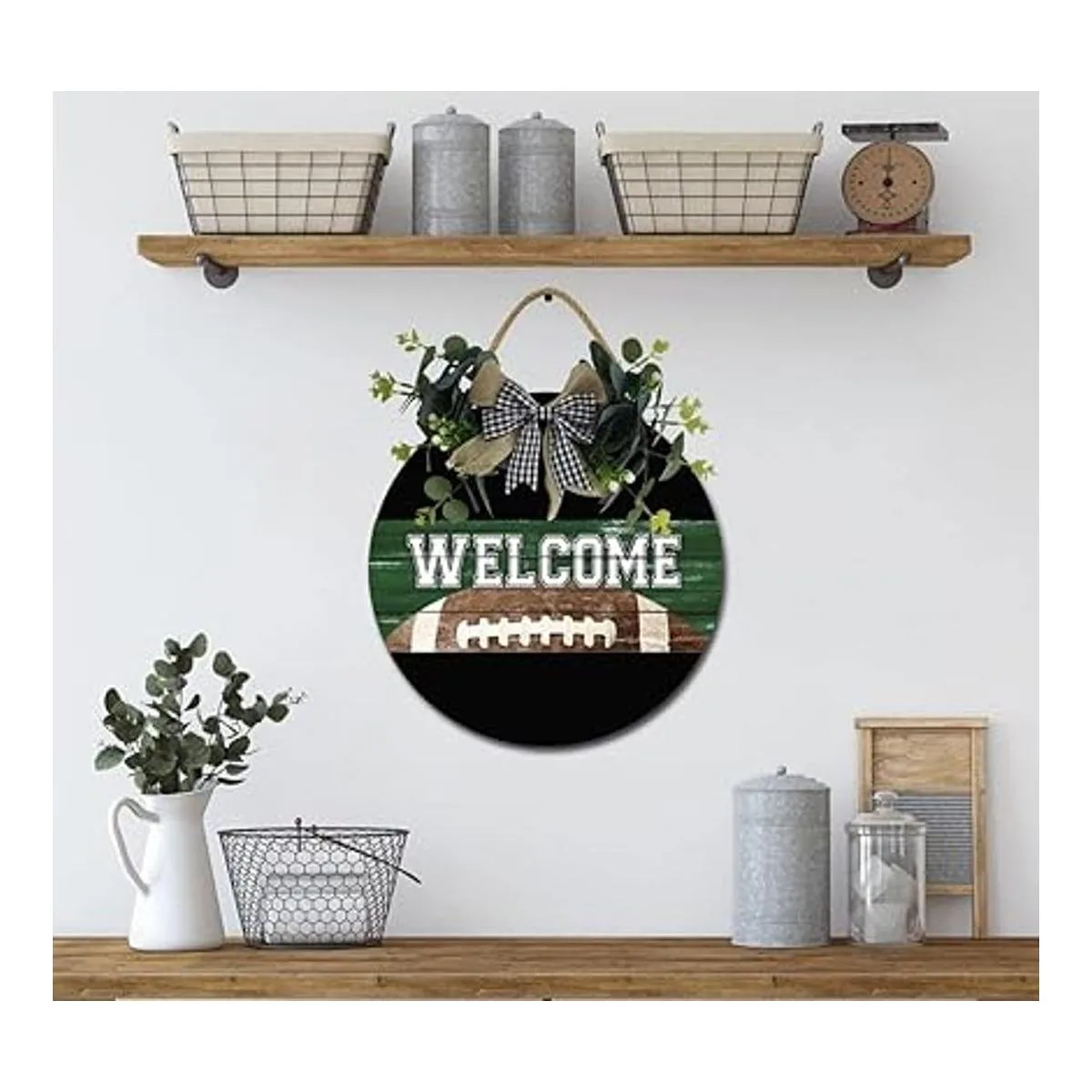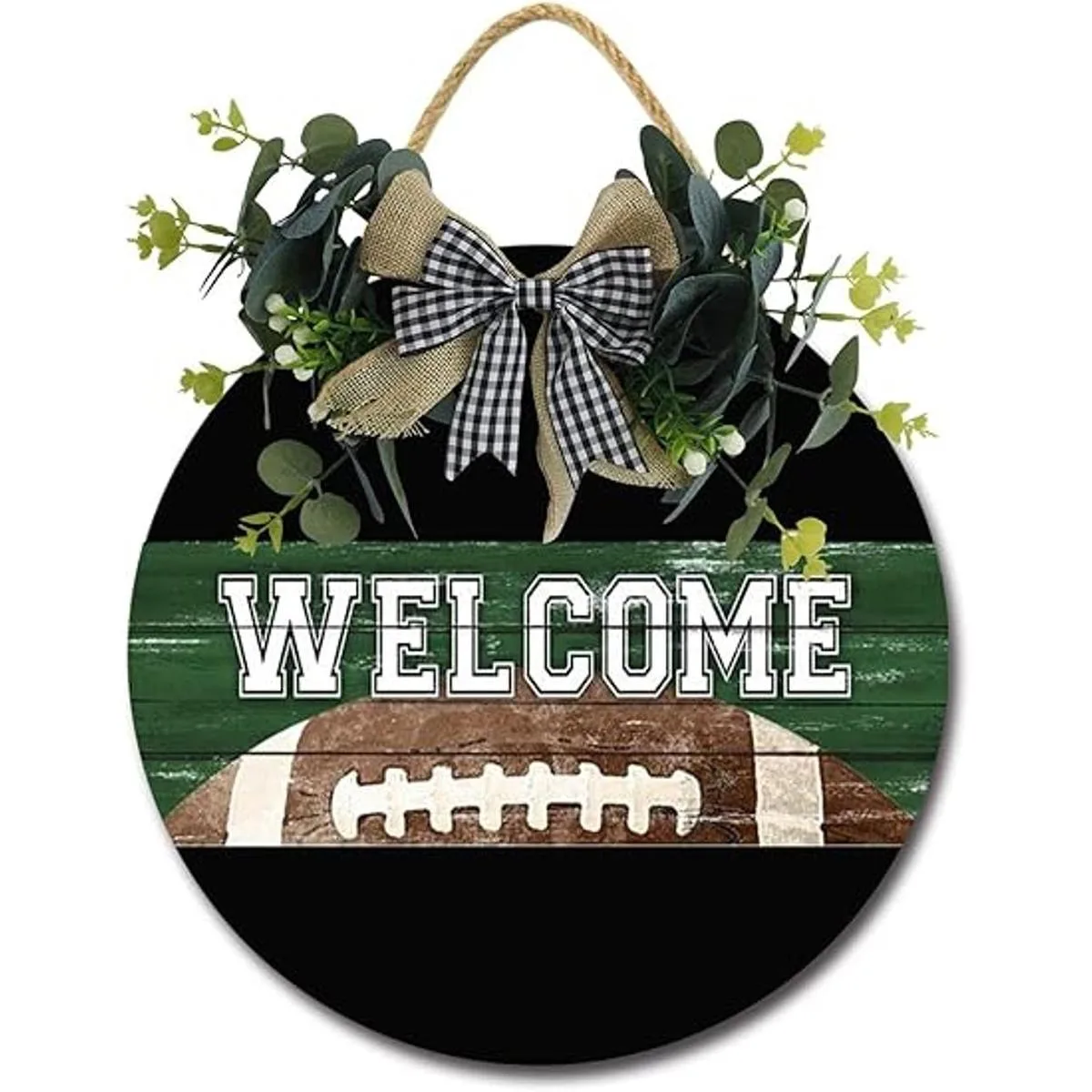 Material de alta calidad: el cartel hecho a mano está hecho de material de madera rústica, cuerda trenzada para colgar, lo que le da una durabilidad superior. Plantas artificiales y un lazo de arpillera a cuadros de búfalo, ilumina tu visibilidad y te mantiene en un estado de ánimo positivo.