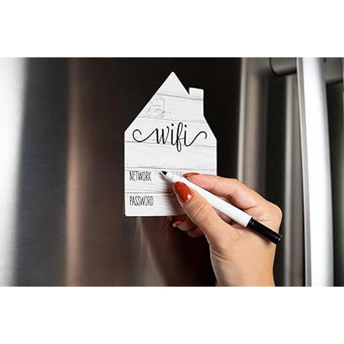 Signo de contraseña wifi: este imán para nevera mide 4 pulgadas de ancho x 5 pulgadas de alto y viene con un bolígrafo blanco borrable húmedo, lo que hace que sea fácil leer en el diseño rústico de tablero de madera negra.