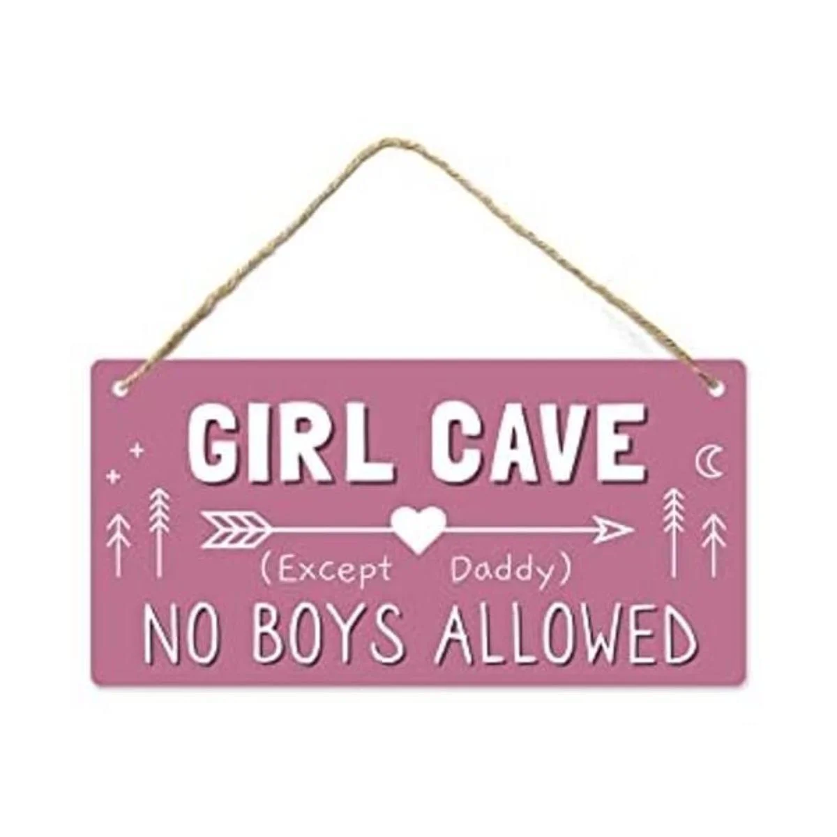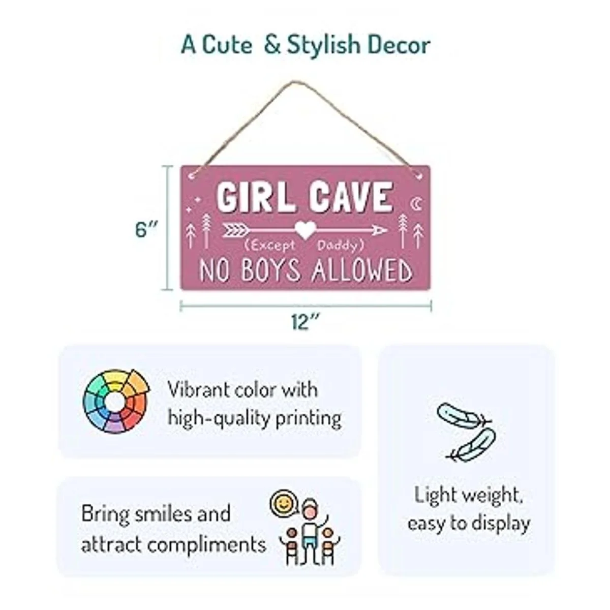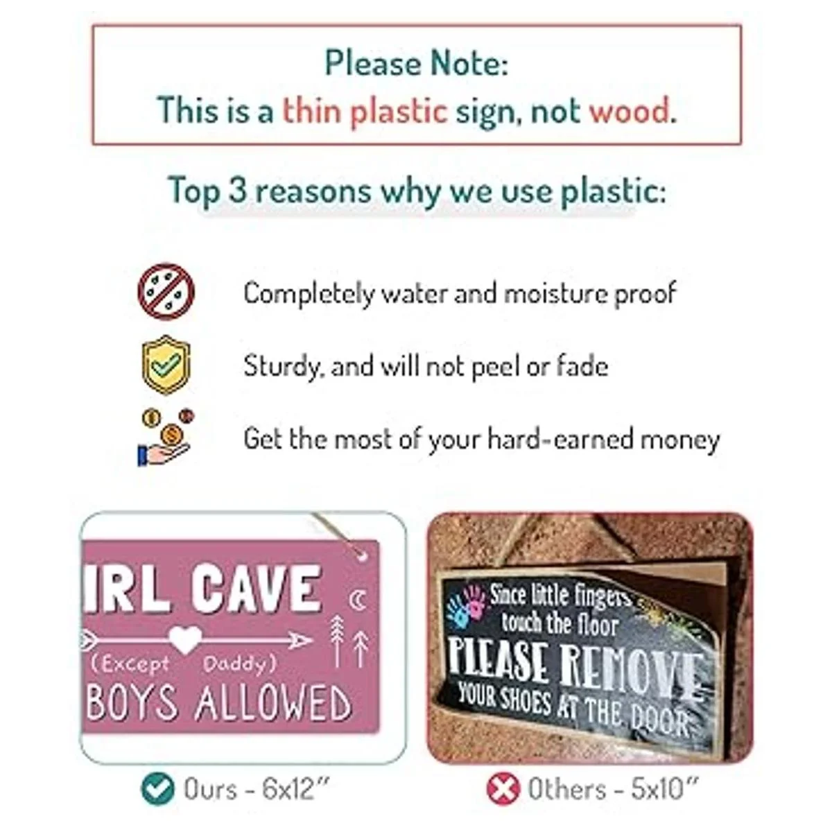 Lo que obtendrás: ten en cuenta que este es un cartel de plástico fino, no de madera. 1 letrero de plástico para cueva de niña. Impresión impermeable de PVC de alta calidad. Dimensiones: 12 x 6 pulgadas. 0.04 pulgadas de grosor, ligeramente más grueso que una tarjeta de crédito estándar.