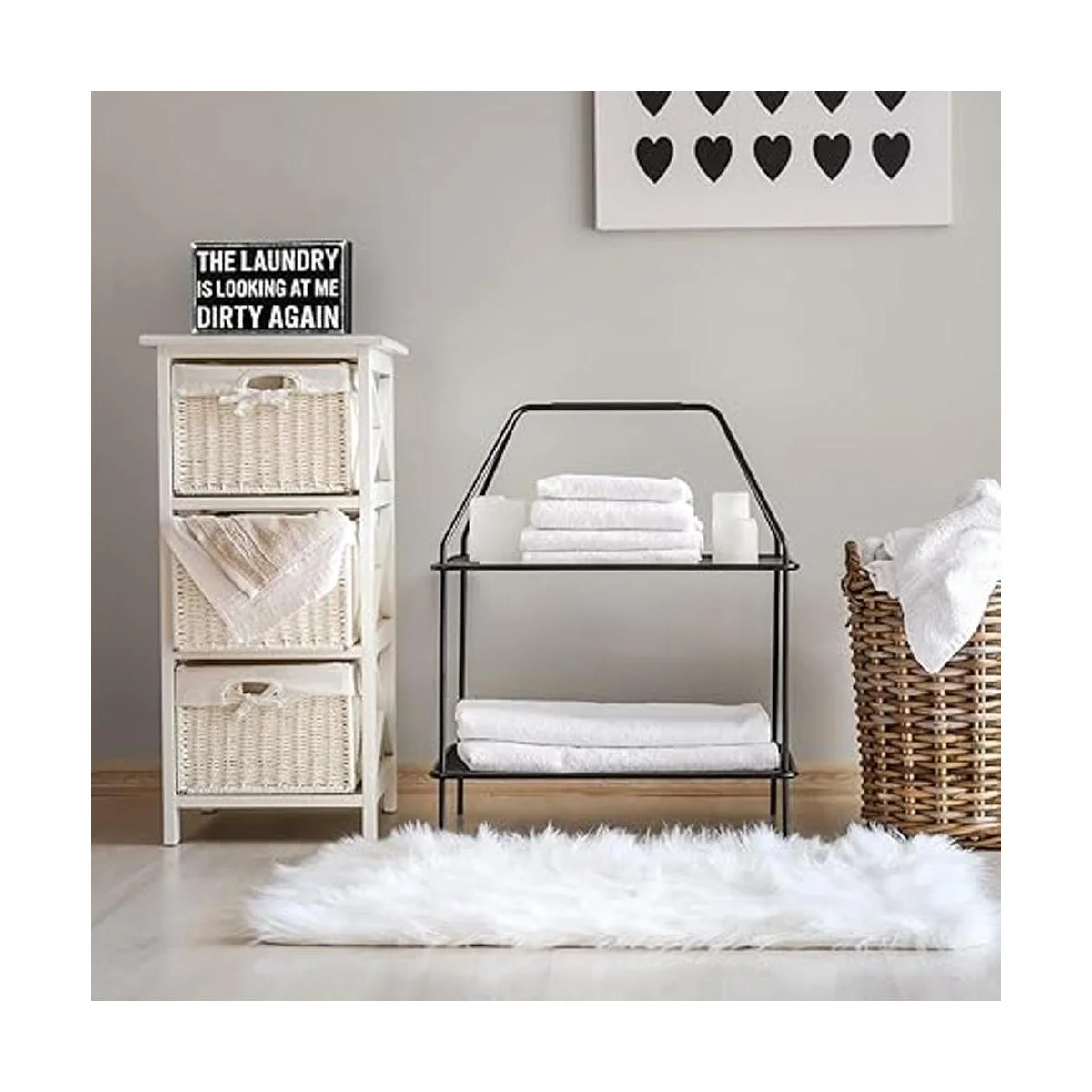 Color tradicional: la decoración de pared de lavandería sucia para el hogar está diseñada en blanco y negro, colores tradicionales y clásicos, que pueden combinar bien con la mayoría de los entornos de tu habitación, mostrando tu buen gusto en la selección y ayudándote a recibir cumplidos de los demás