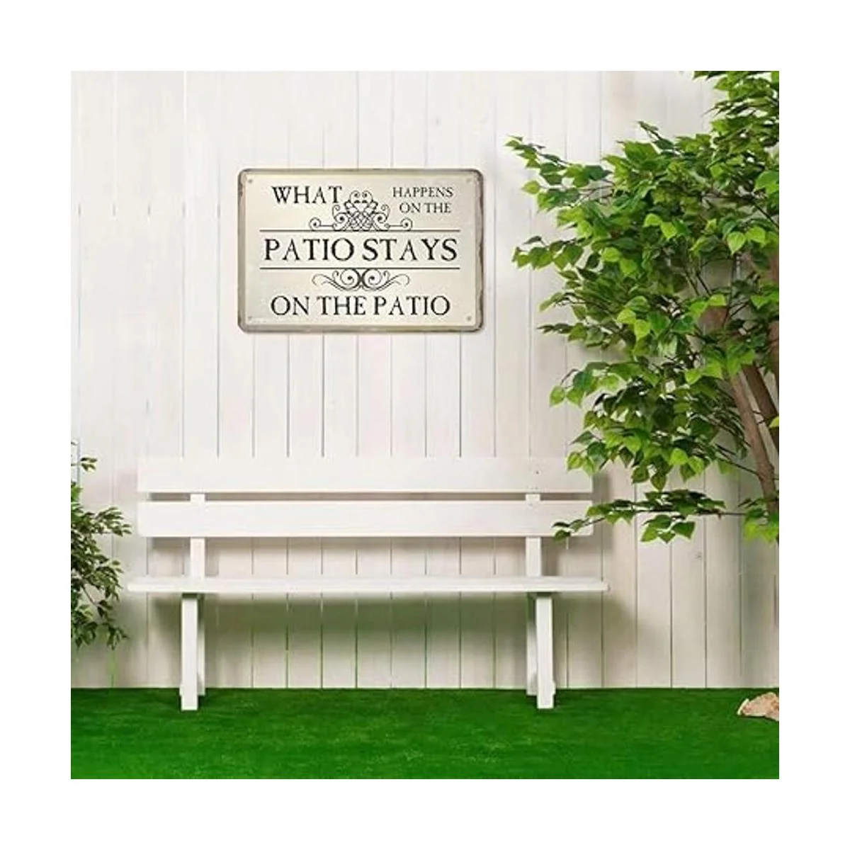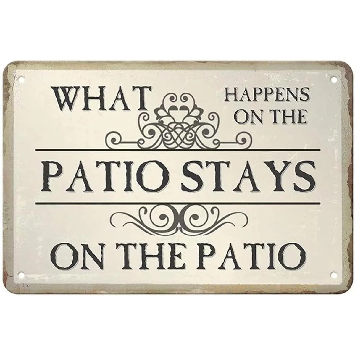 Letrero de metal vintage con texto en inglés What Happens on the Patio Stays on the Patio Letrero de metal para dormitorio, cafetería, bar, pub, café, cerveza, cocina, baño, puerta, jardín, decoración de pared, 8 x 12 pulgadas