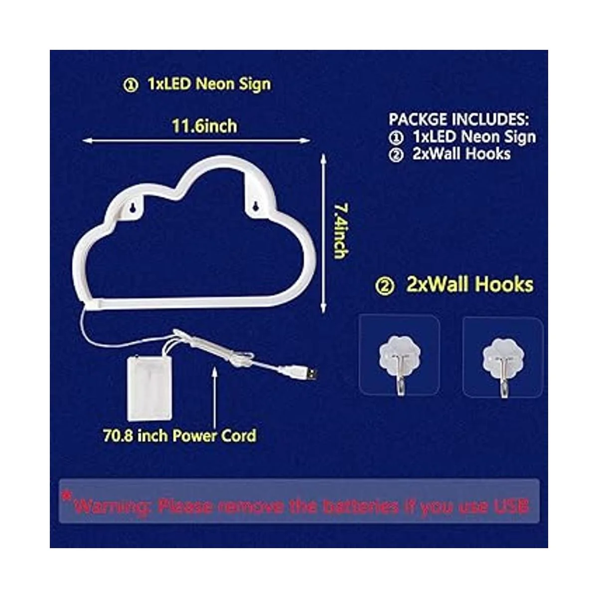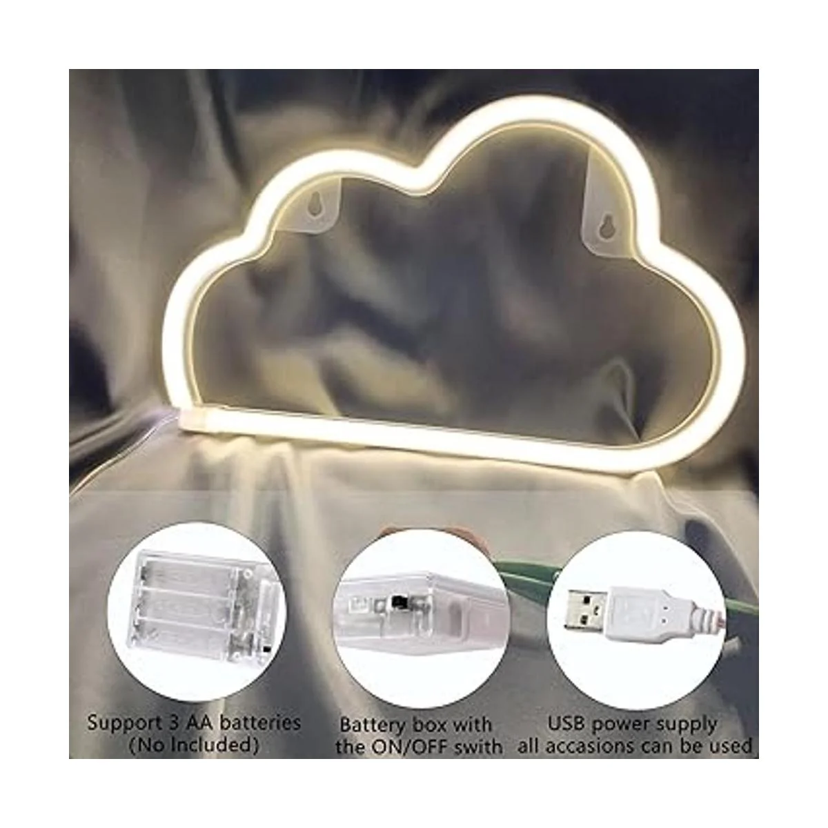 Opciones de potencia dual y fácil de colocar: esta luz de neón de nube para pared solo requiere 3 baterías AA no incluidas o conectadas por USB por favor, retira las baterías si usas USB, simplemente conecta la interfaz de tu computadora o el puerto USB para abrir el letrero de neón al aire libre. El tamaño de las luces de neón es de 11.6 x 7.4 pulgadas, viene con cable de alimentación de 70.8 pulgadas, luz nocturna en forma de nube con 2 agujeros detrás 2 ganchos adhesivos incluidos, puedes colgarlo en la pared o ponerlo en la mesa, rápido y fácil de instalar.