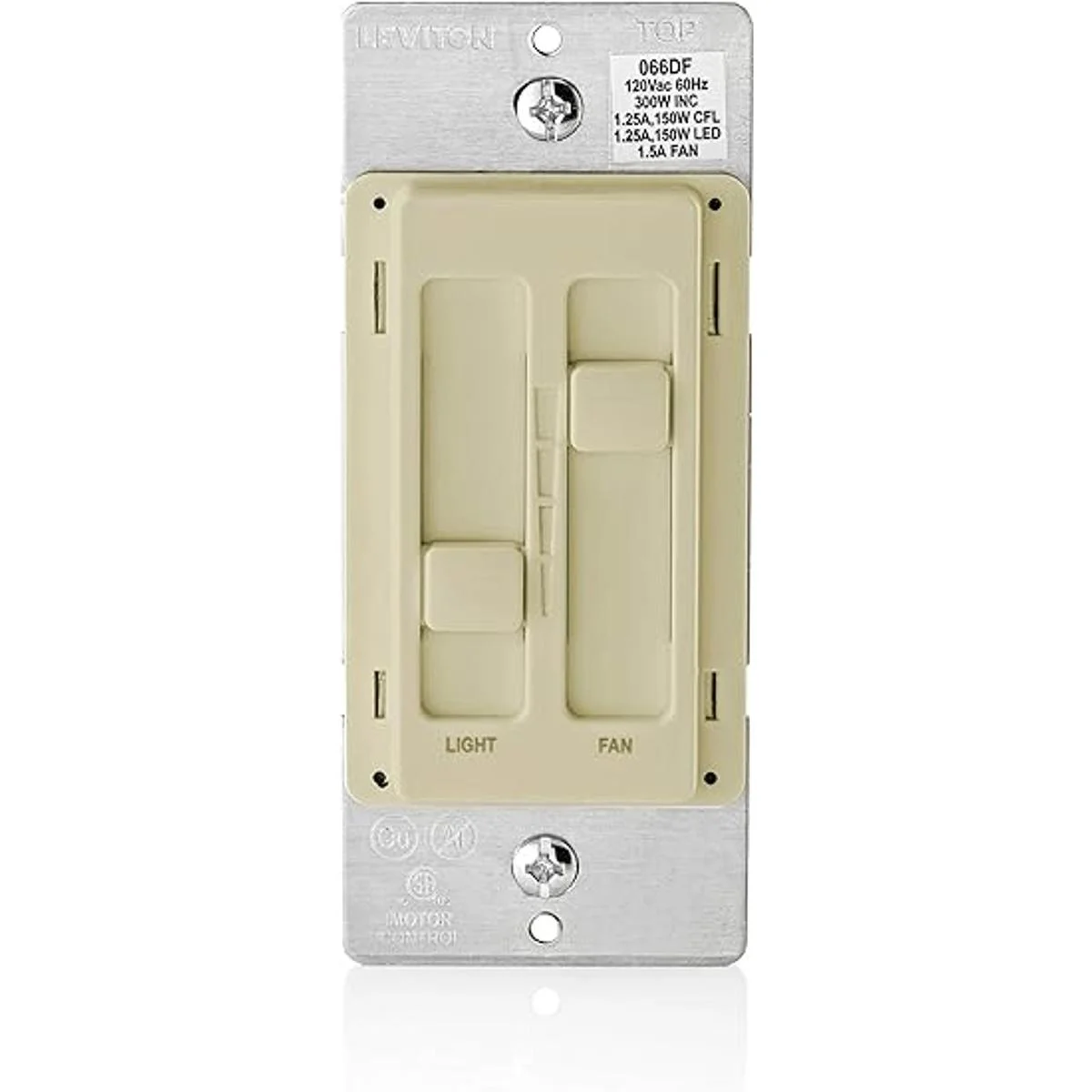 Leviton 66DF10I SureSlide Control de luz silenciosa doble para LED de 150 W, incandescentehalógeno de 300 W, ventilador de 1,5 A, 120 V, color marfil
