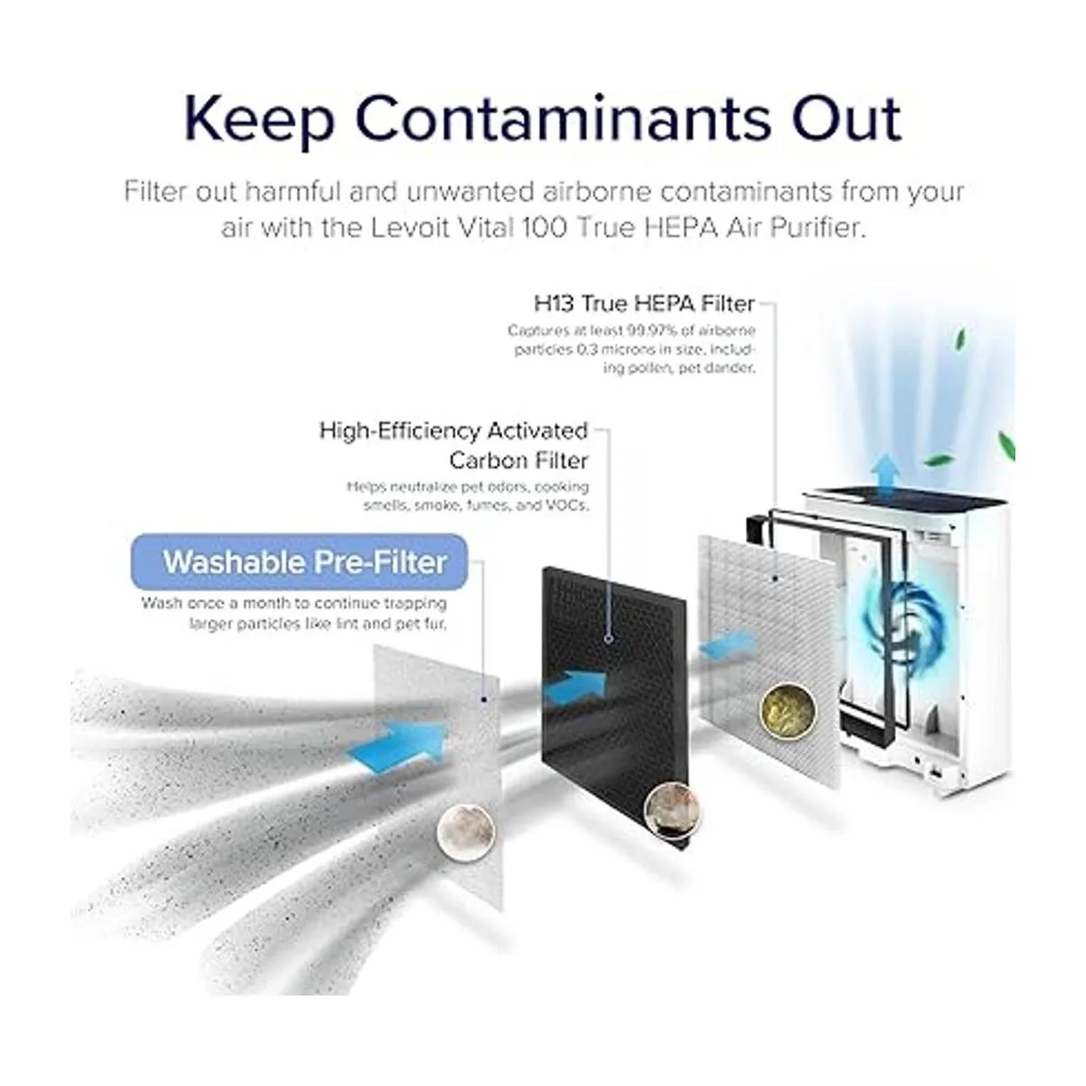 LEVOIT Vital 100 Purificador de aire silencioso para habitaciones grandes del hogar, con limpiador de filtro H13 True HEPA y filtro lavable, libre de ozono, para alergias y mascotas, fumadores, moho, polen, polvo y eliminar olores color blanco.