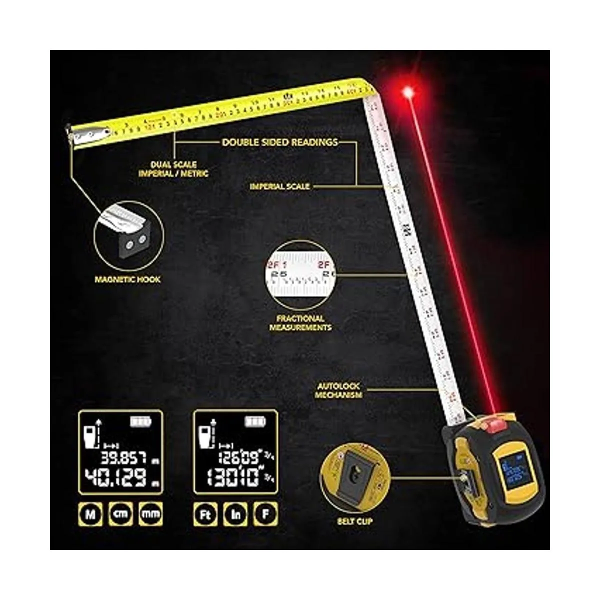 Innovador: el diseño 2 en 1 combina una medida de distancia láser de 131.2 ft y cinta métrica AutoLock de 16.4 ft