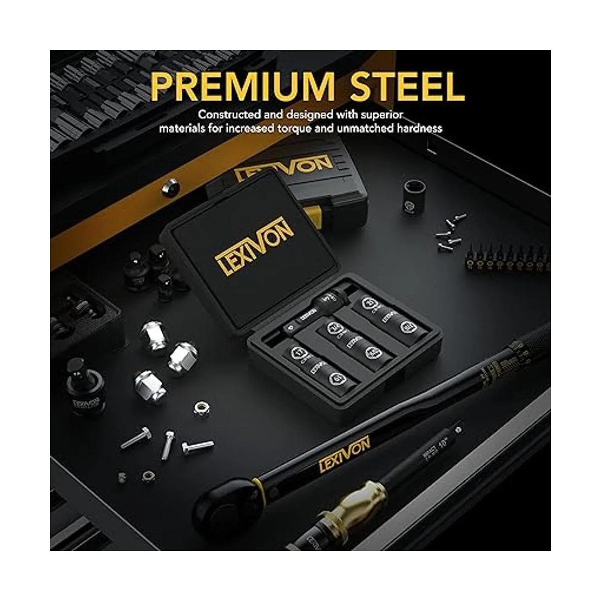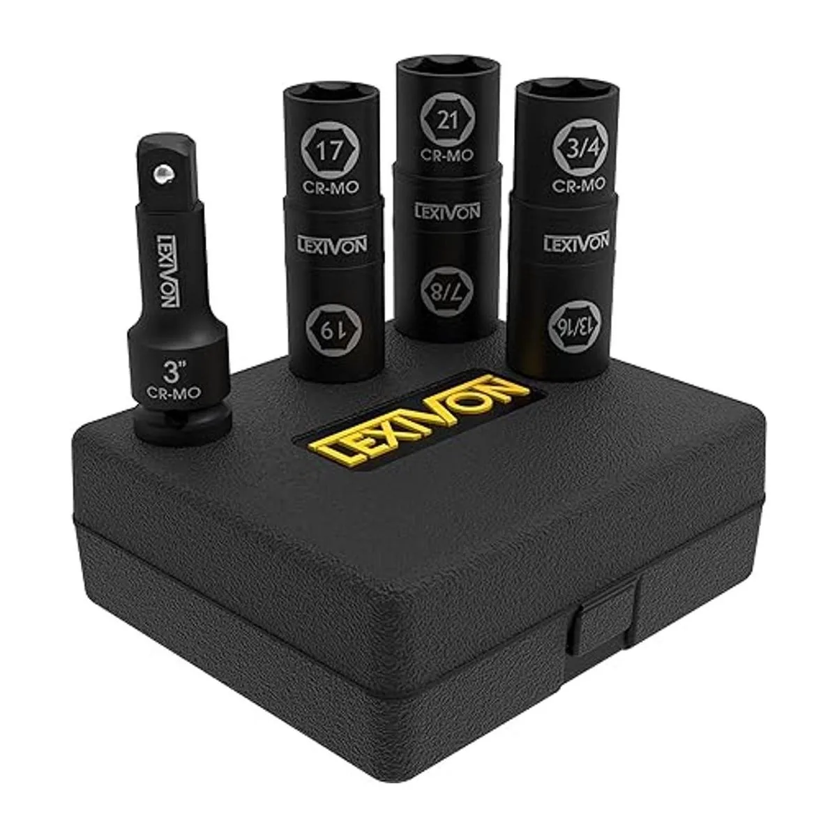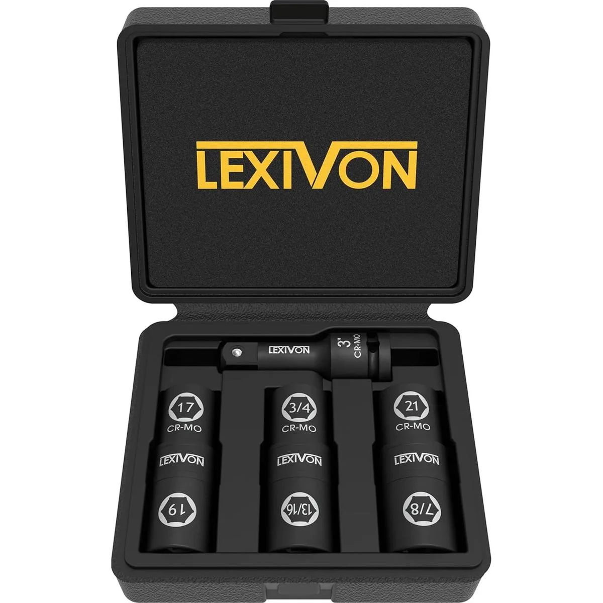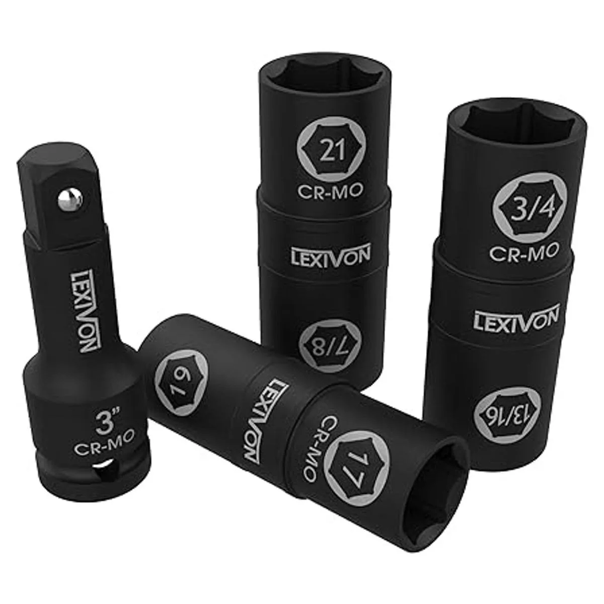 LEXIVON Juego de llaves de impacto de 12 pulgada, 6 tamaños totales de tuercas Innovador diseño de zócalo abatible, cubre las tuercas de rueda métricas y pulgadas más utilizadas Acero CrMo, grado de impacto completo LX111