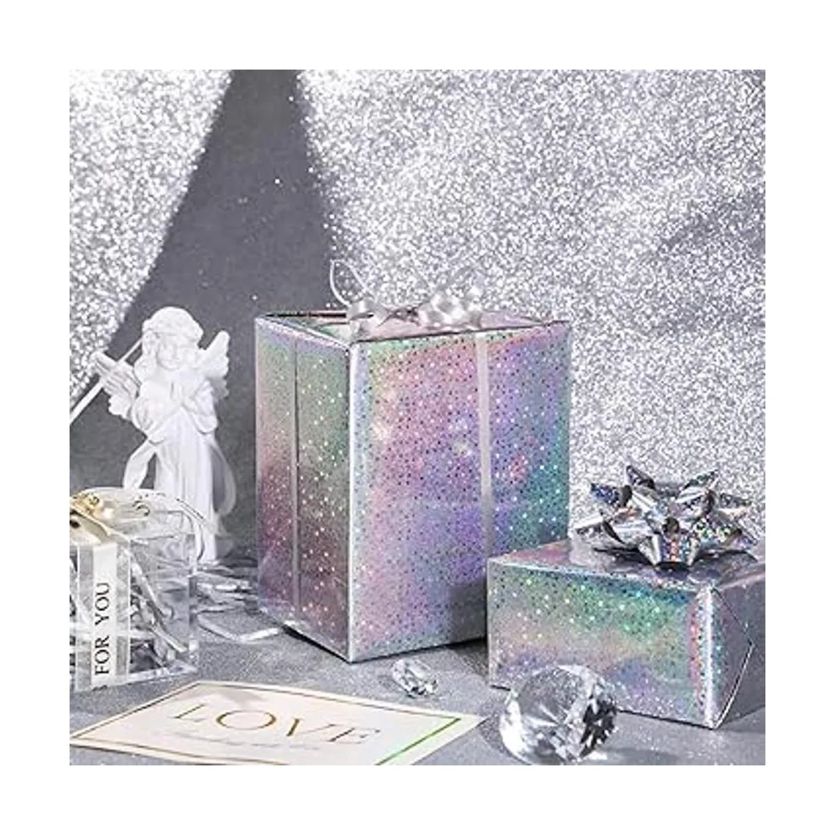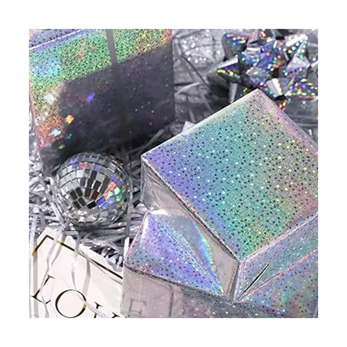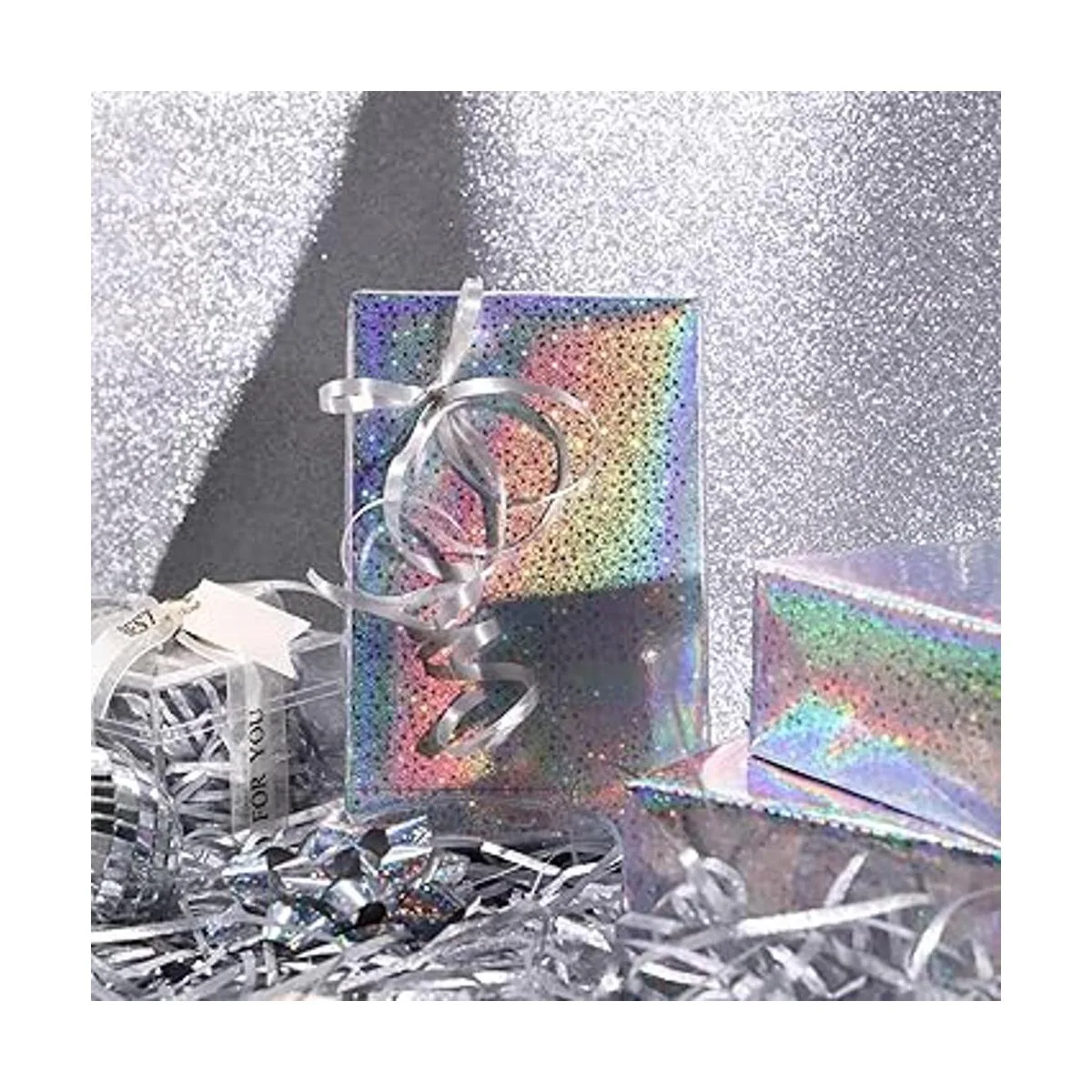 Lámina holográfica: el papel holográfico de regalo está impreso con estrellas en plata como se muestra en la imagen. El color del patrón cambiará bajo la luz o se verá desde diferentes ángulos, haciendo que el regalo sea más hermoso.