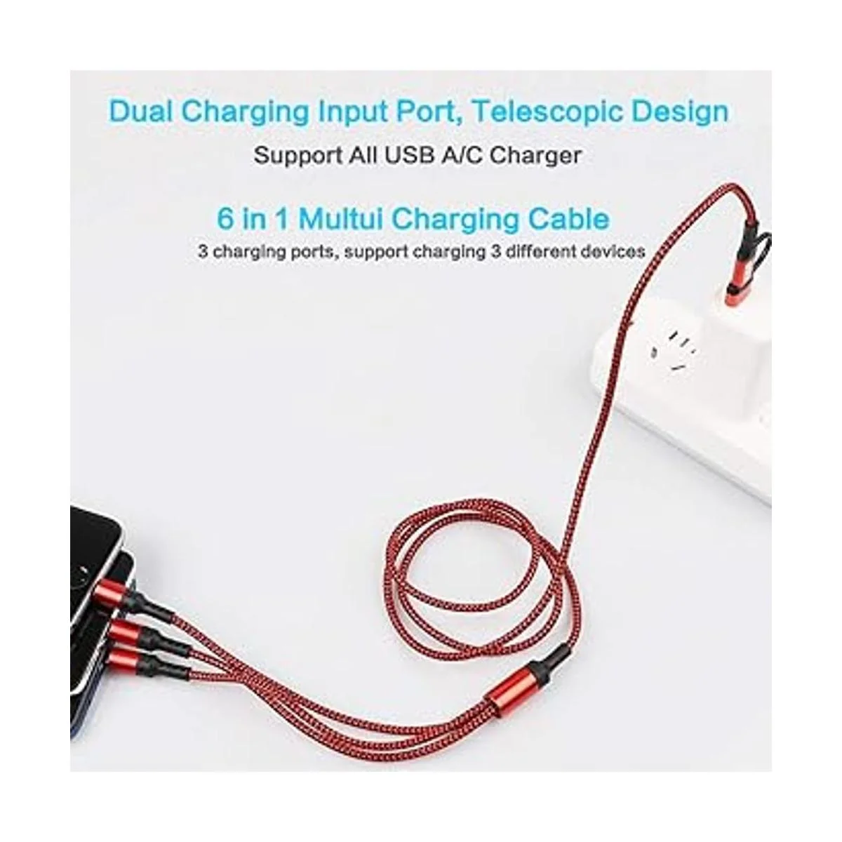 LHJRY Cable de carga múltiple 6 en 1, paquete de 3 cables de carga múltiple de 4 pies USB AC al teléfono, USB C, cable de carga compatible con teléfonos celulares, tabletas y más rojo, negro, azul