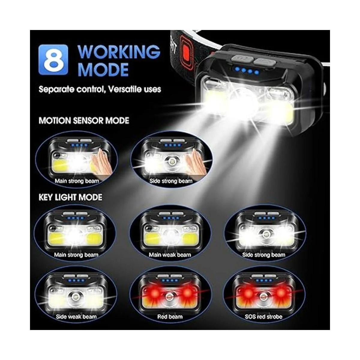 Resistente al agua y 8 modos: el faro tiene una tasa de impermeabilidad IPX4. La carcasa de alta calidad es más sellada y a prueba de fugas, lo que es adecuada para lluvia o nieve, en interiores o exteriores. El faro LED tiene 8 modos de iluminación para satisfacer tus diversas necesidades. En modo de luz de tecla, puedes cambiar el haz fuerte principal, haz débil principal, haz fuerte lateral, haz débil lateral, haz rojo, estroboscópico rojo SOS. En modo de sensor de movimiento, puedes cambiar el haz fuerte principal y el haz fuerte lateral.
