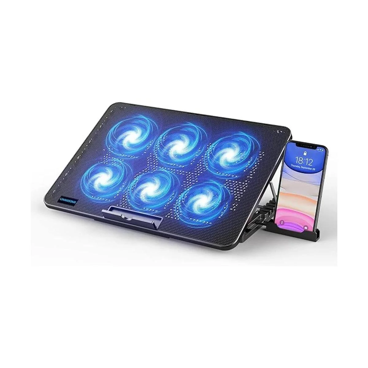 LIANGSTAR Almohadilla de refrigeración para laptop, enfriador para laptop con 6 ventiladores silenciosos para portátil de 12 a 17 pulgadas, soporte estable, 7 altura y velocidad del viento ajustable, 2 puertos USB y soporte para teléfono negro