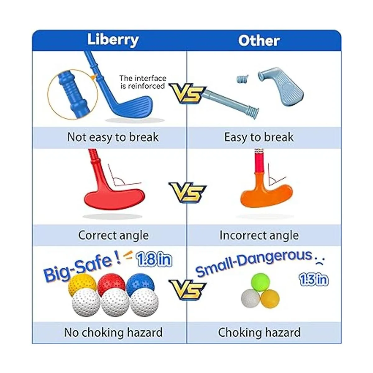 Seguro y duradero: la última versión del juego de golf para niños de Liberry se produce con plástico de alta calidad inodoro y no tóxico. El juego de golf para niños pequeños no incluye piezas o bordes que estén dentados o puntiagudos. La dureza del palo se mejora y no es fácil de romper. Debido a que nuestras pelotas de golf son más grandes 1.8 pulgadas de diámetro, puede evitar eficazmente los peligros de asfixia