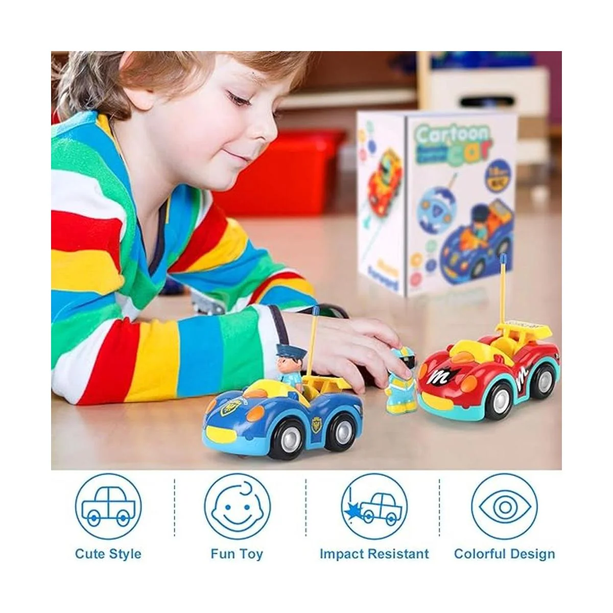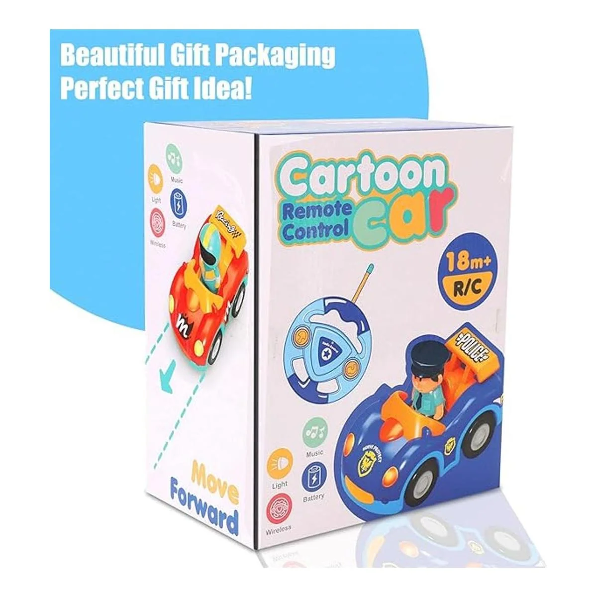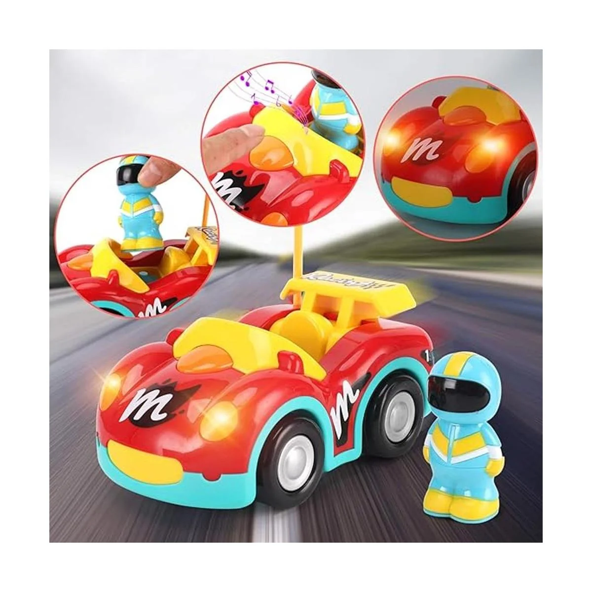 Fácil de controlar: control remoto de 2 canales para adelante y atrás a la izquierda. Diseñado como un primer juguete de control remoto para niños, este coche de dibujos animados viene con un controlador RC con forma de volante con sólo 2 botones para un fácil control simple.