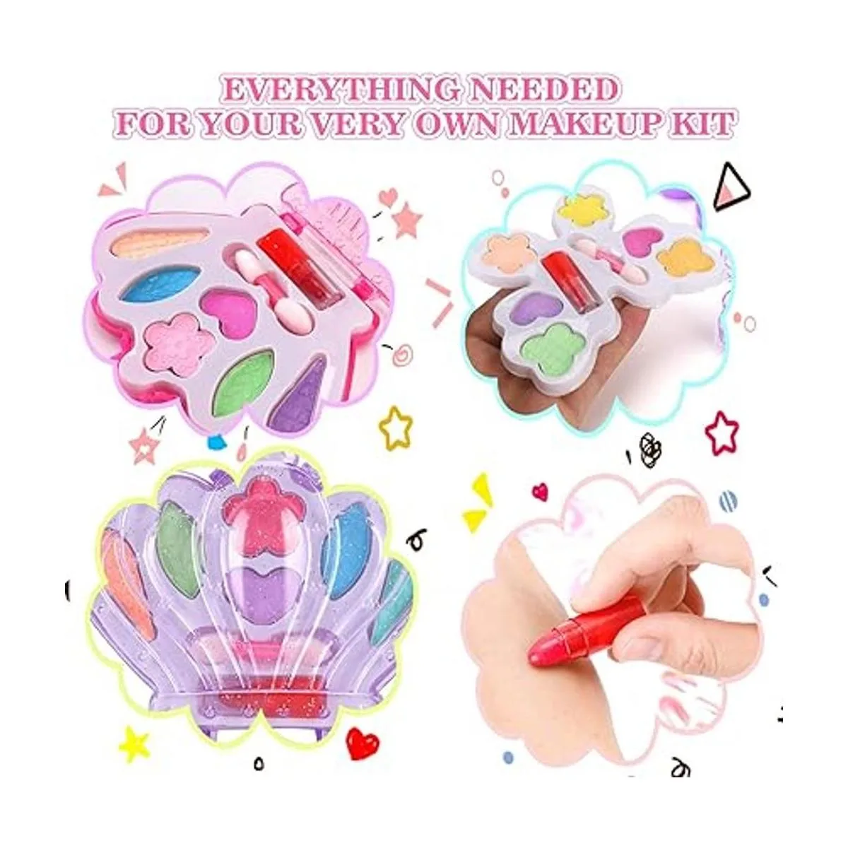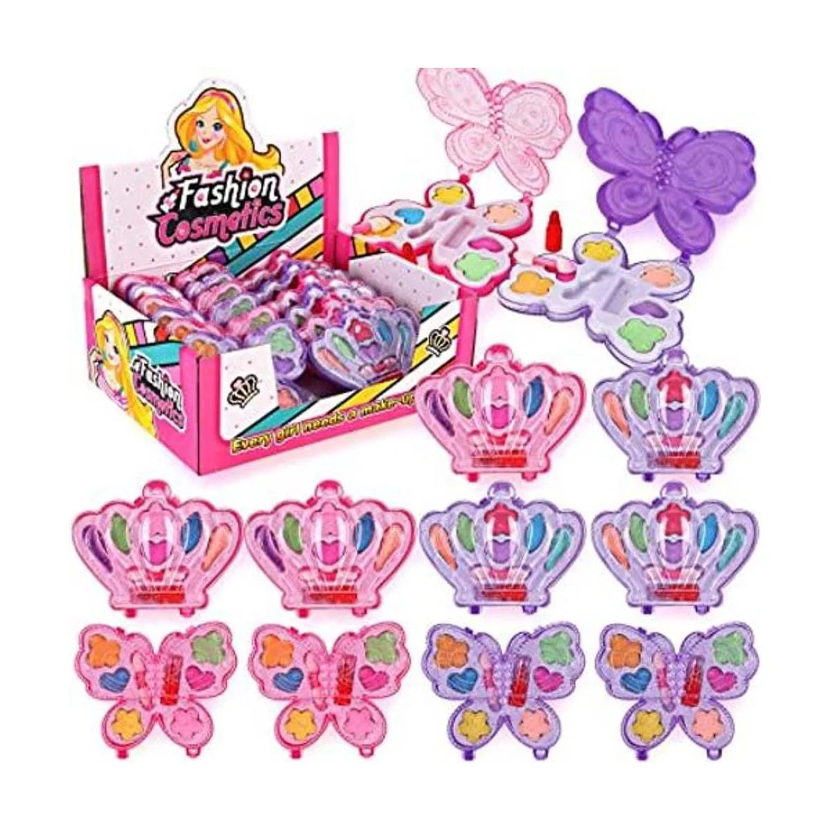 Incluye: paletas de maquillaje en forma de corona/mariposa que vienen con polvo de rubor, polvo de sombra de ojos y lápiz labial. Piezas que una niña necesita para su propio kit de maquillaje