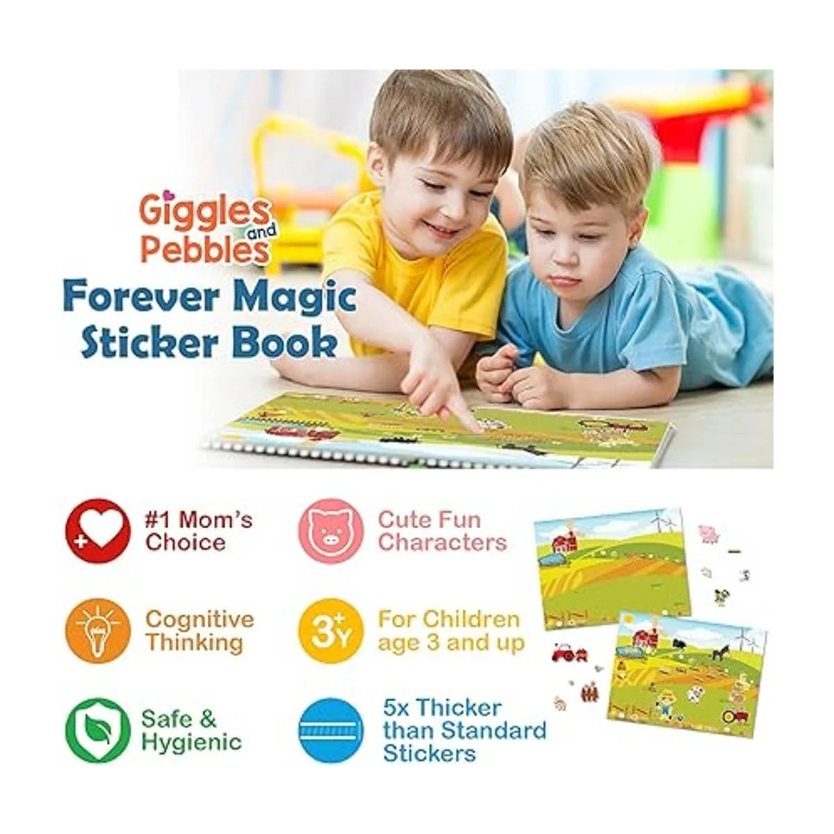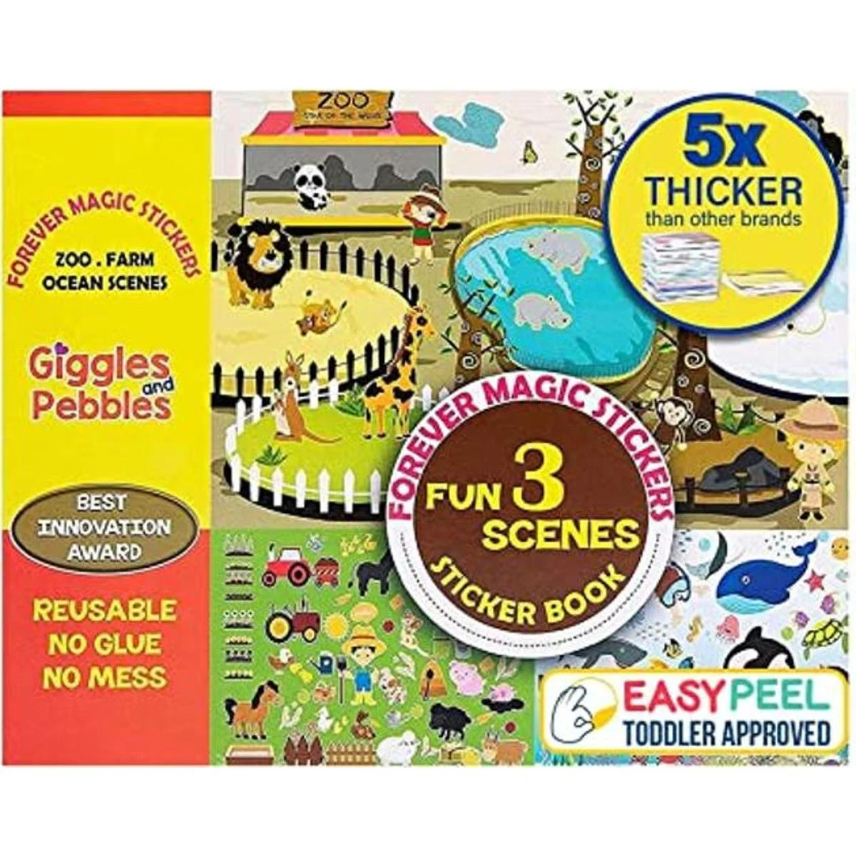 Libro de calcomanías con 3 escenas divertidas: libro educativo de calcomanías con 3 escenas con personajes de granja, zoológico y animales del océano que atienden a la curiosidad natural de los niños. Con más de 170 piezas de calcomanías, las calcomanías mágicas Giggles and Pebbles crean innumerables horas de educación, diversión y entretenimiento. El libro de calcomanías también incluye un área de almacenamiento de calcomanías fácil y conveniente dentro del libro para que no pierdas tus preciosas calcomanías