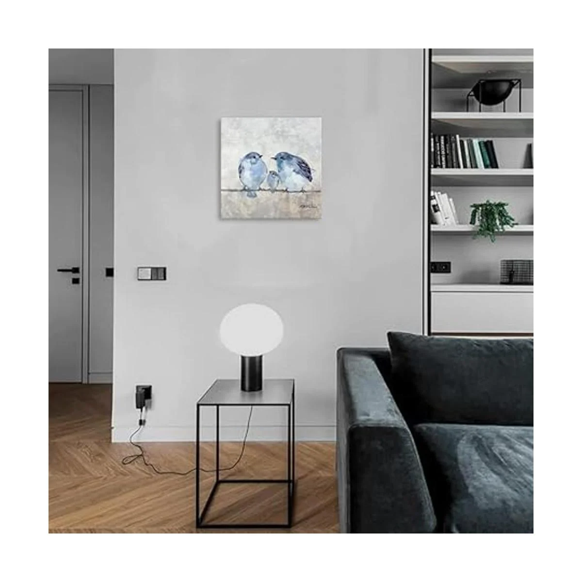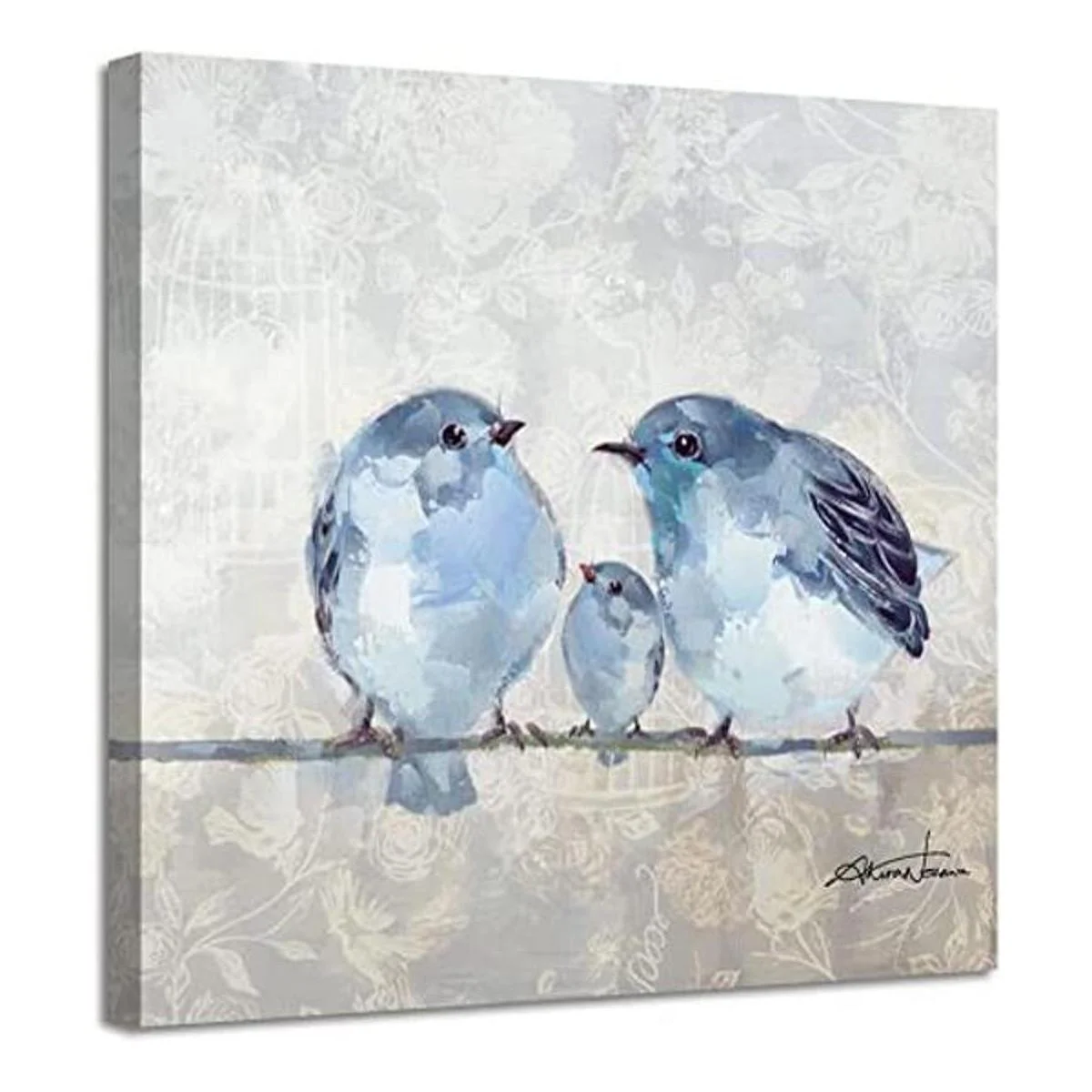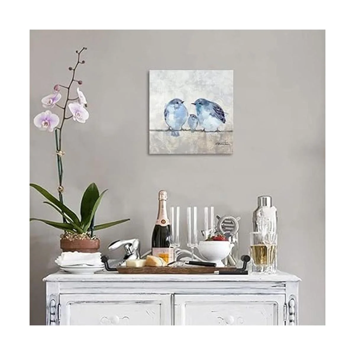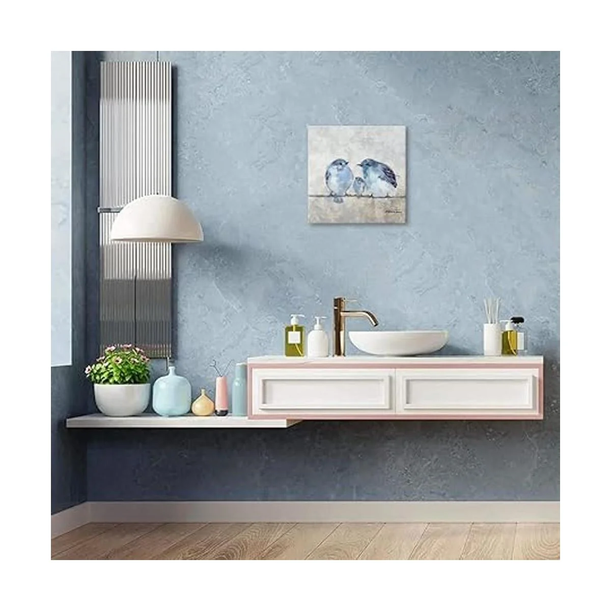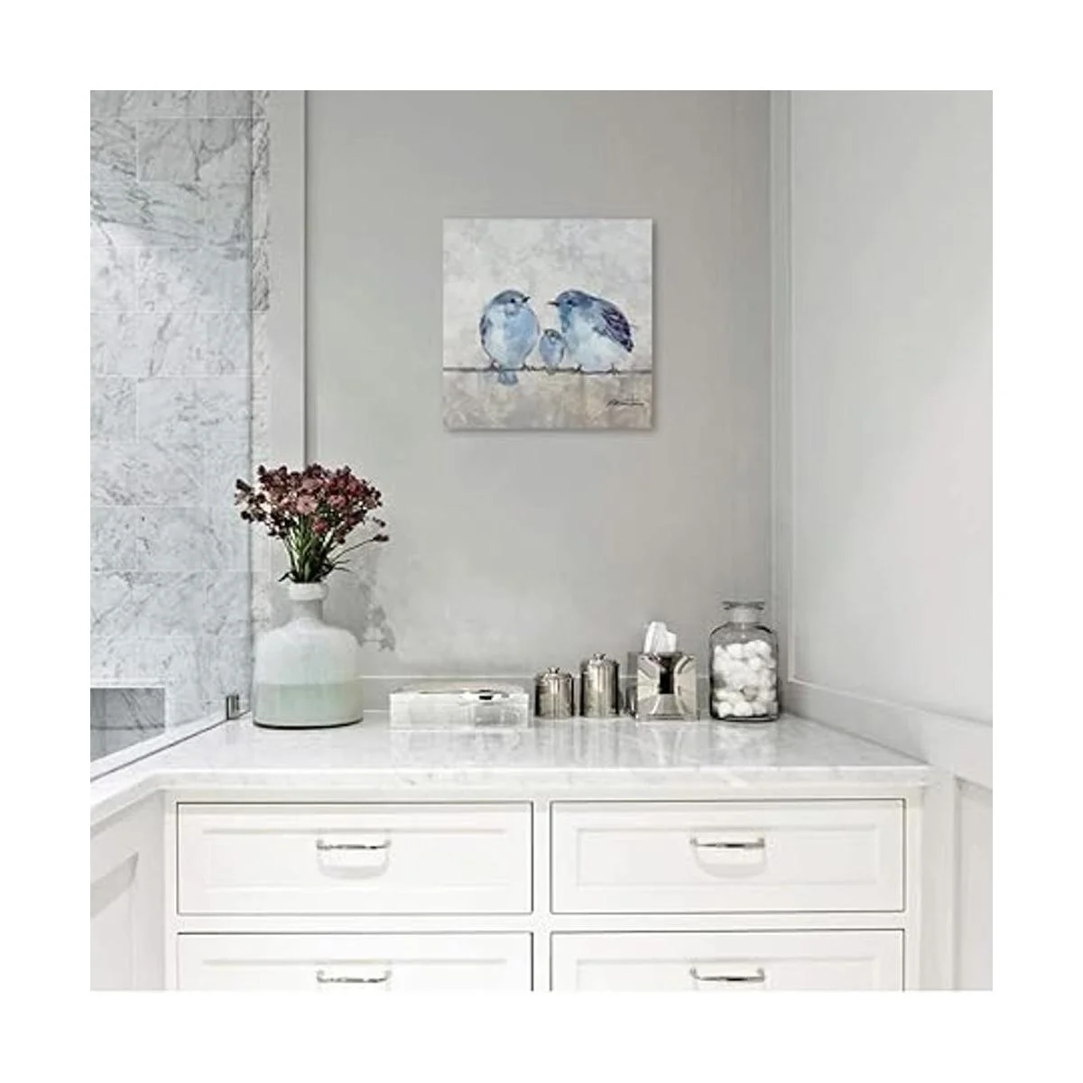 Lienzo de pájaro para pared, decoración de fotos de color azul y gris para baño, 13.5 x 13.5 pulgadas
