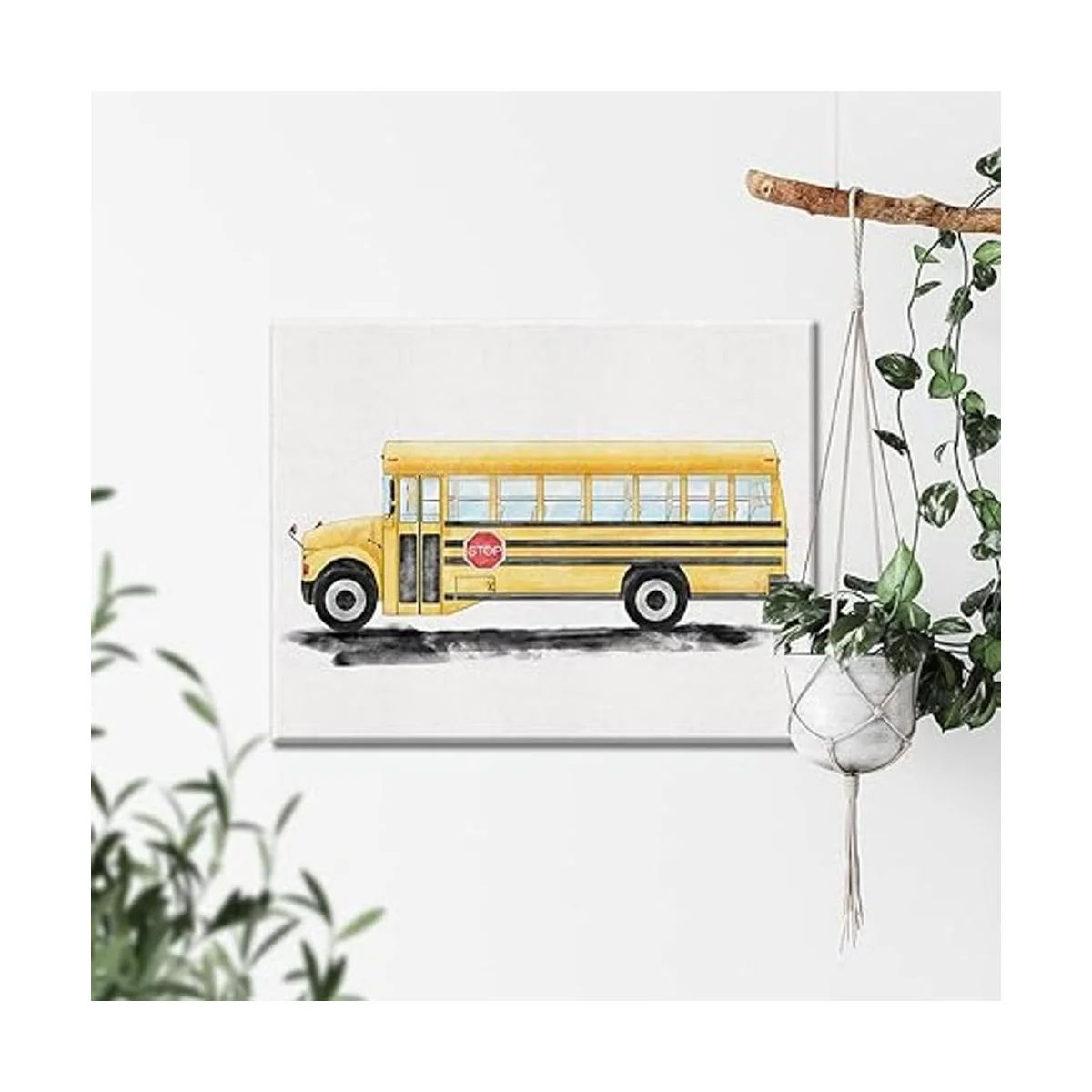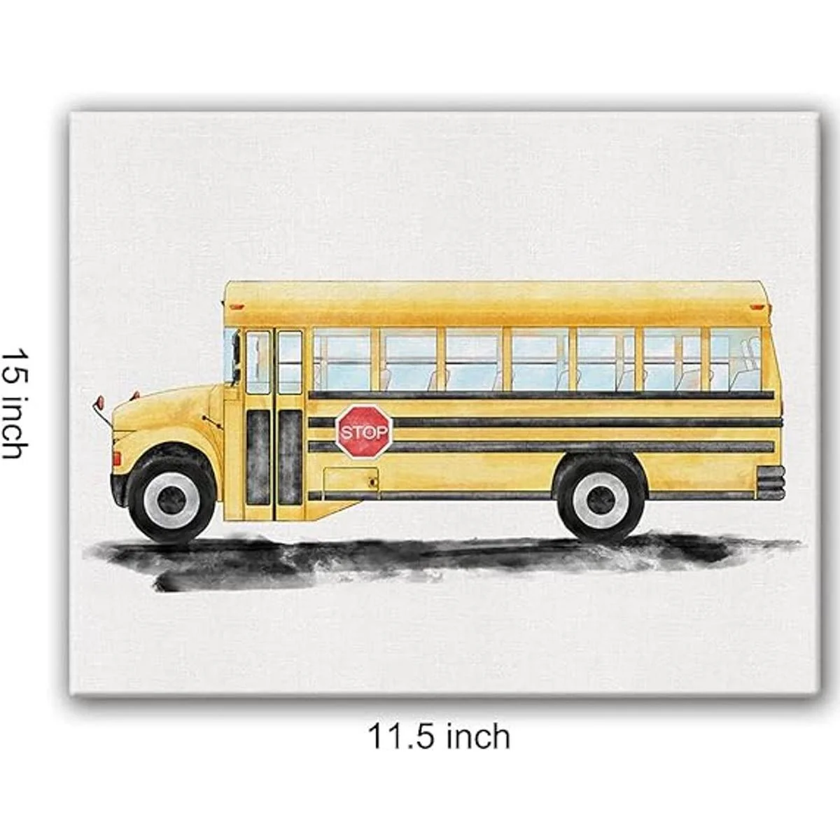 Lienzo decorativo para pared de autobús escolar, diseño de acuarela, vehículos de transporte, autobús escolar, impresiones para el hogar, dormitorio de los niños, decoración de pared enmarcada 12 x 15 pulgadas