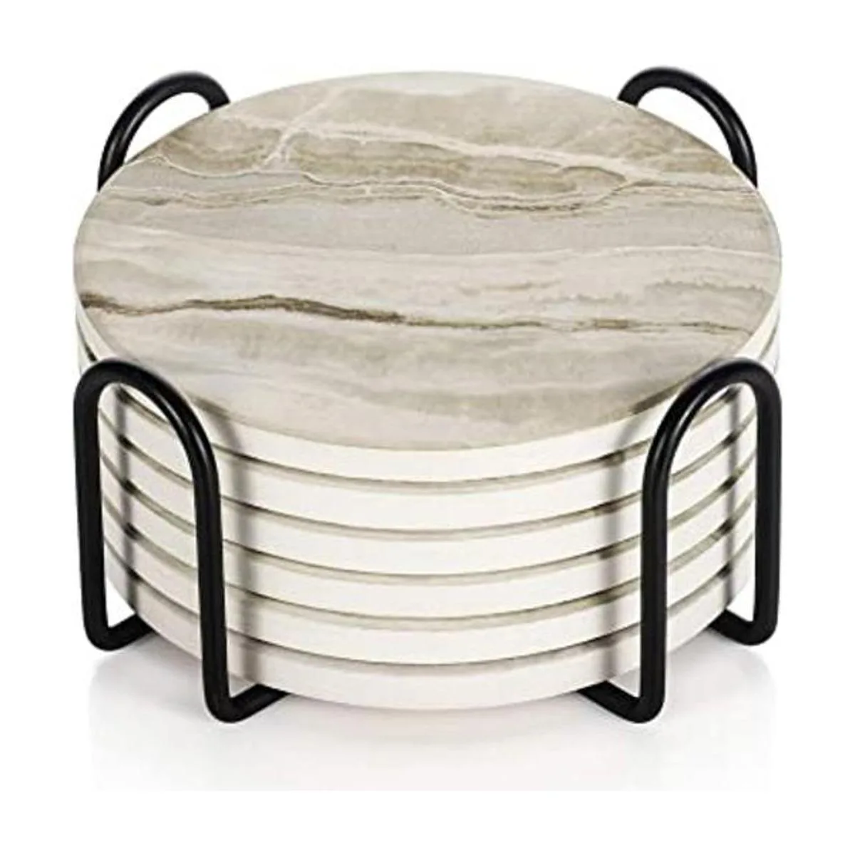 Juego de posavasos con soporte de metal: el juego incluye 6 posavasos redondos de cerámica patrón de superficie de mármol, 4 pulgadas y un soporte de metal negro de 4.5 pulgadas.