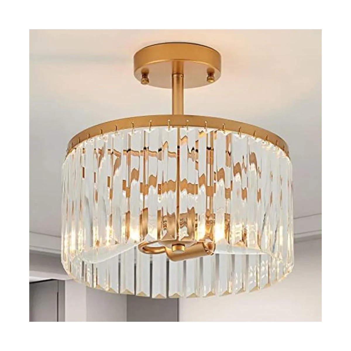 Shiny Crystal Pendant Design This semi flush mount light fixture is made of exquisite golden painted craftsmanship, smooth and no paint peeling. The lampshade is surrounded by 38 clear crystals. Warm light and shadow will bring a glamorous and romantic feeling to your room.