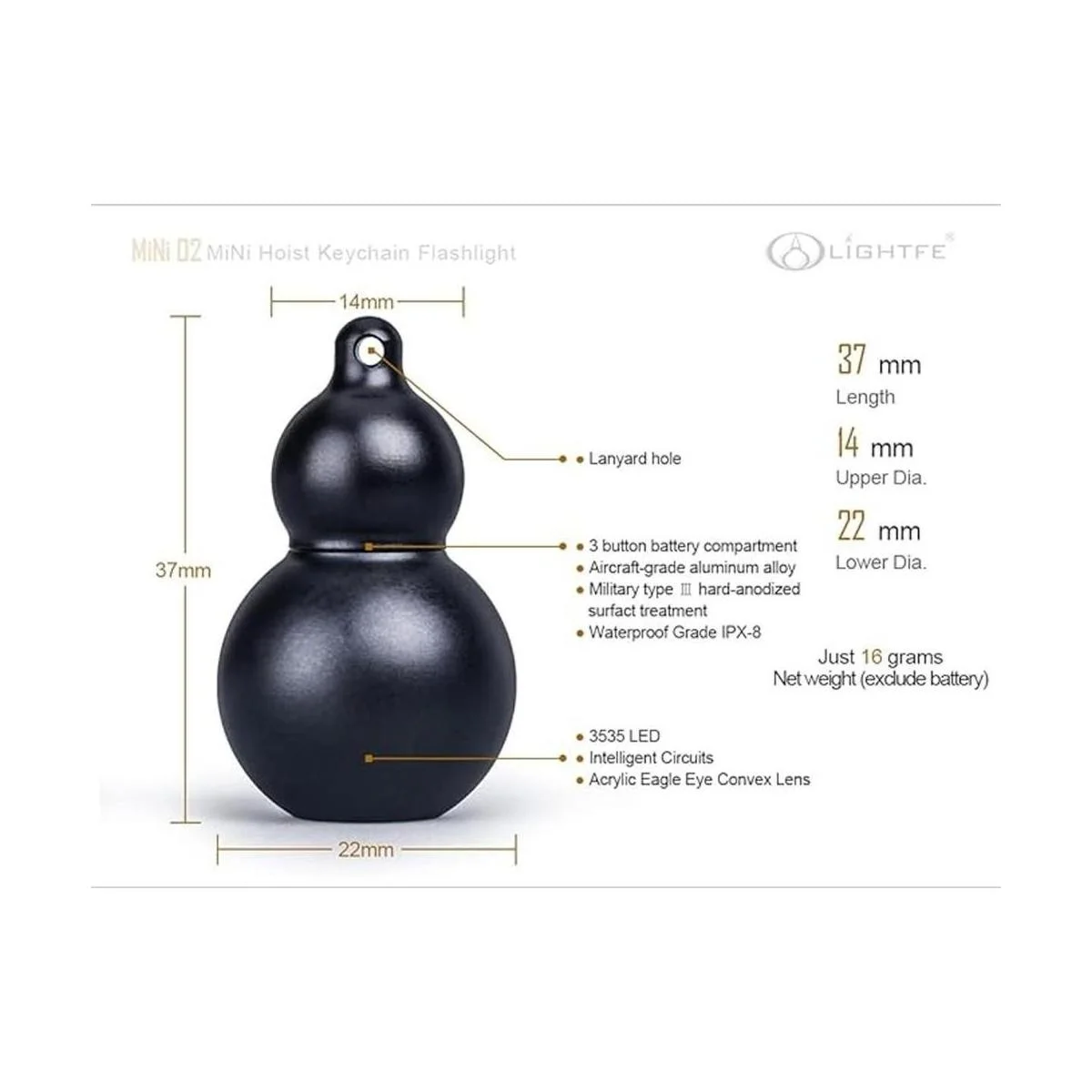 Especificaciones físicas: 1. Impermeabilidad IPX8. Lente: Lente lenticular óptico. 3. Resistencia al impacto: limitado 4.9 ft. Tamaño del producto: longitud 1.457 in, diámetro superior Diámetro inferior de 0.551 in. 0.866 in. Peso: 0.56 oz sin batería 6. Material: aleación de aluminio aeroespacial de alta resistencia. Tratamiento superficial: tratamiento antiabrasivo MiliSpec III Hardanozided