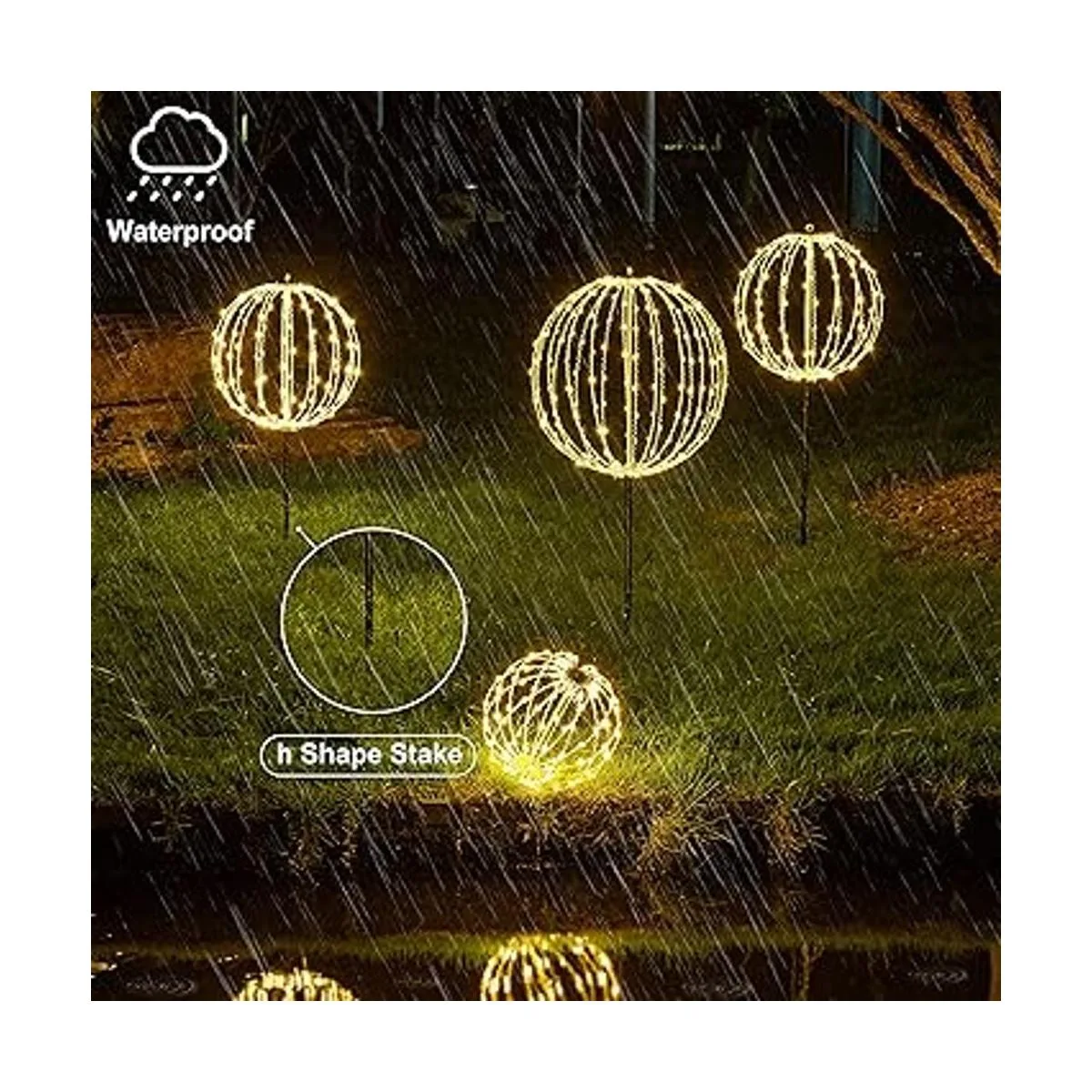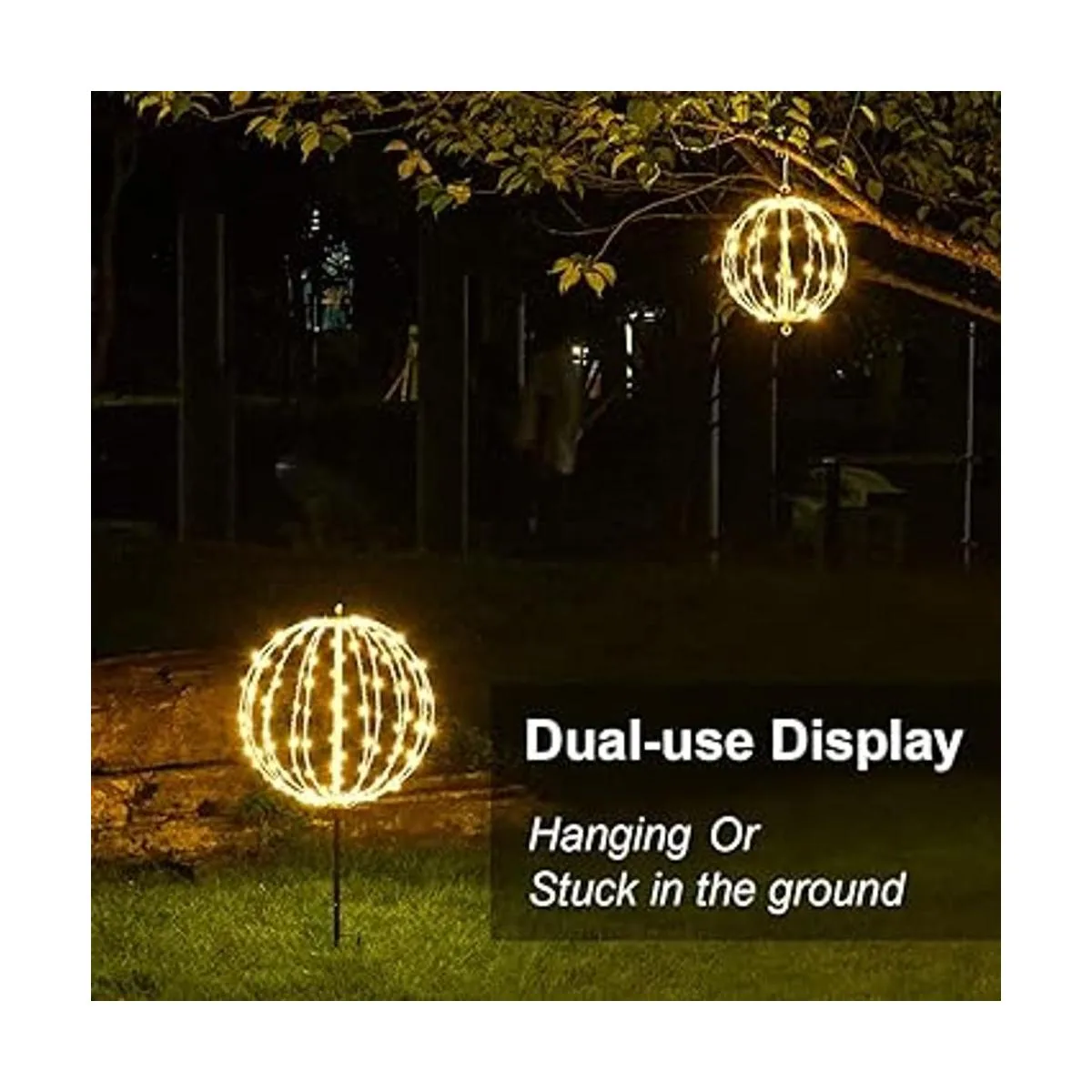 Material fiable e impermeable: las luces de bola de Navidad para exteriores están hechas de marco de metal plano plegable y bombillas LED de bajo consumo, que son robustas y fiables, no te preocupes por el mal tiempo en áreas abiertas, pueden proporcionar un alto brillo claro, funcionan bien incluso en días lluviosos; duran mucho tiempo