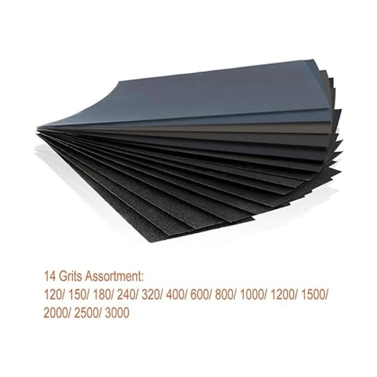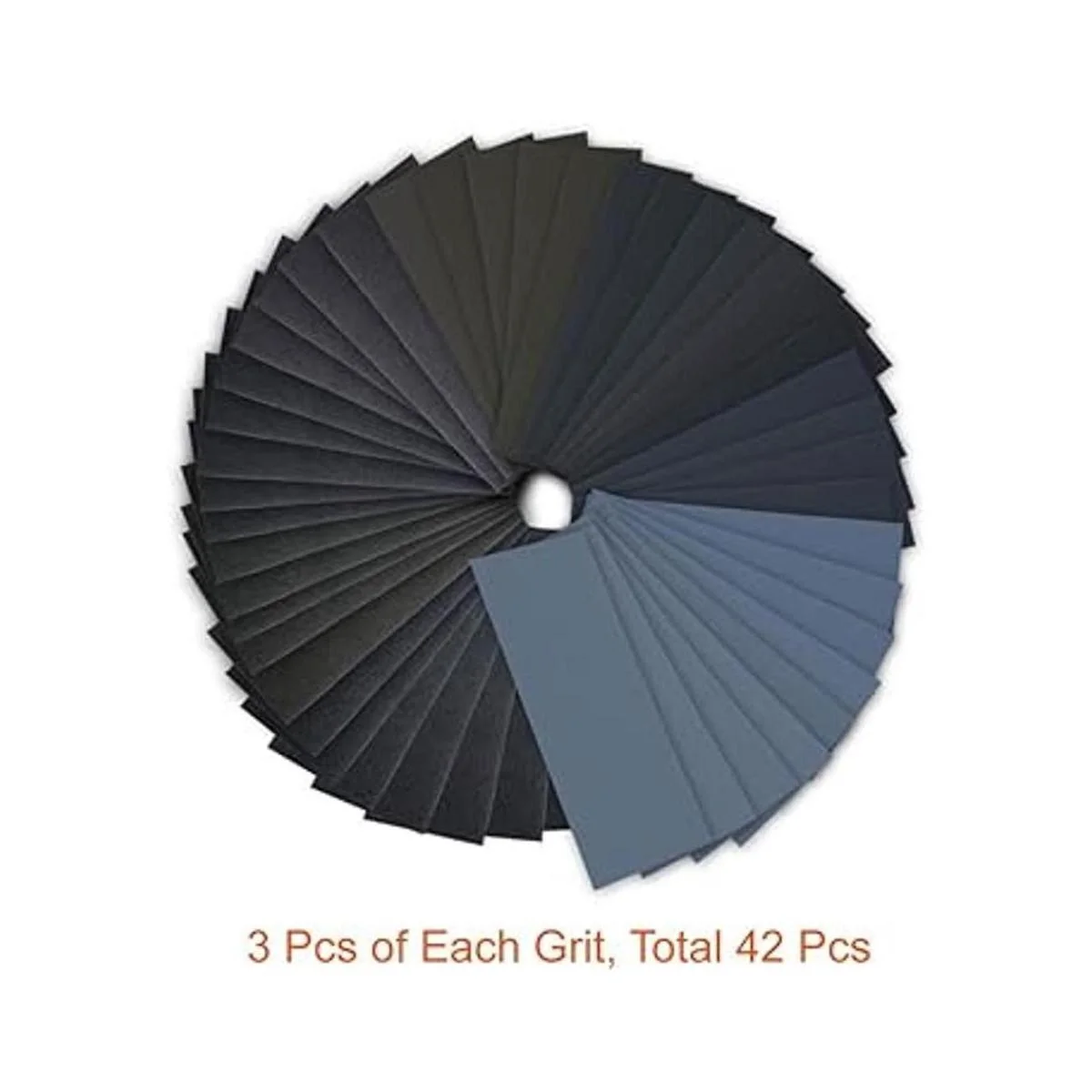 INCLUDED ALL YOU NEED Package comes with 3 sheets of each grit in 120/ 150/ 180/ 240/ 320/ 400/ 600/ 800/ 1000/ 1200/ 1500/ 2000/ 2500/ 3000 totaling 42 sheets