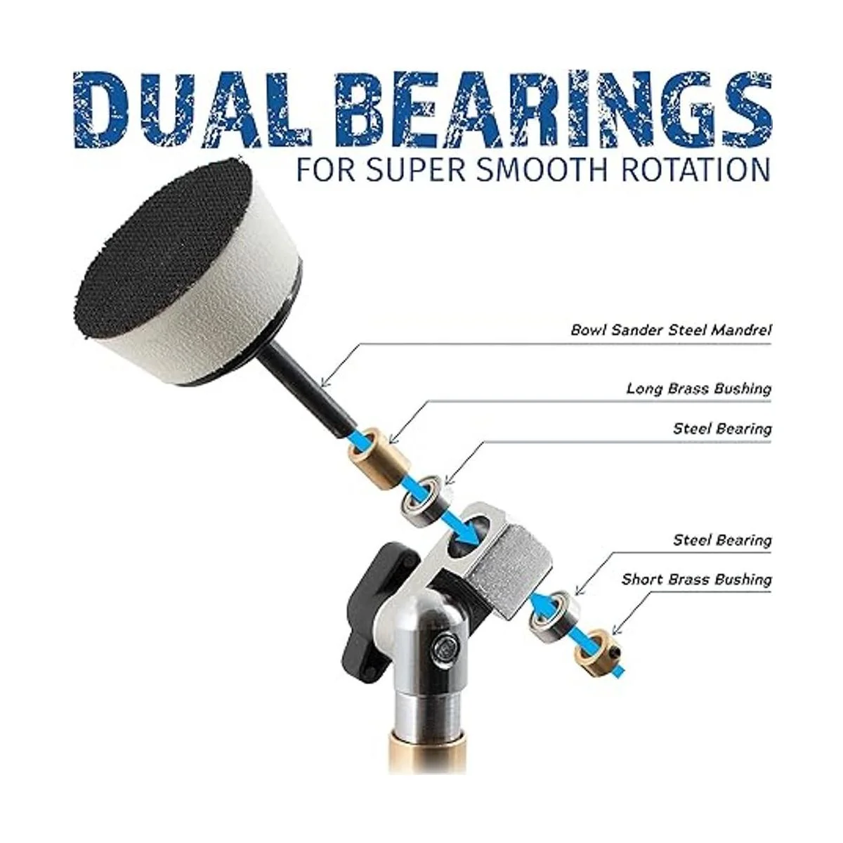 El montaje de la cabeza es completamente ajustable por lo que se puede ajustar a cualquier ángulo que necesites dependiendo del tamaño y la curva de tu proyecto. A diferencia de la mayoría de otros conjuntos de cabezales de lijadora de cuencos, nuestra lijadora de cuencos tiene dos rodamientos de acero para proporcionarte una rotación de mandril súper suave mientras lijas en tu torno. Esto también ayuda a reducir la posibilidad de marcar tu madera, ya que la lijadora girará sin colgar o atrapar como muchas otras marcas.