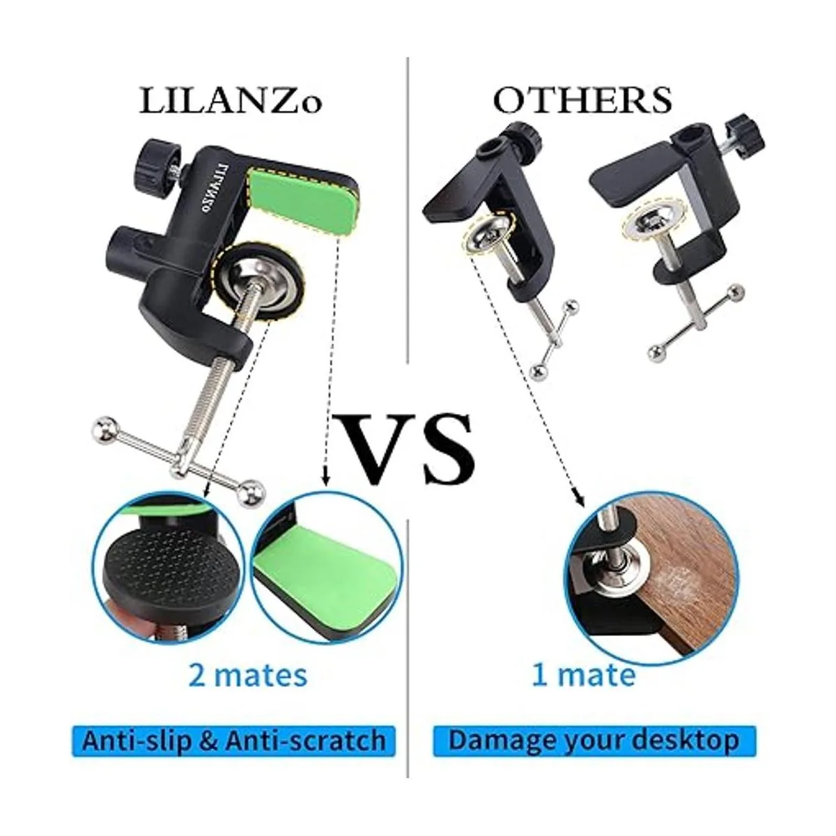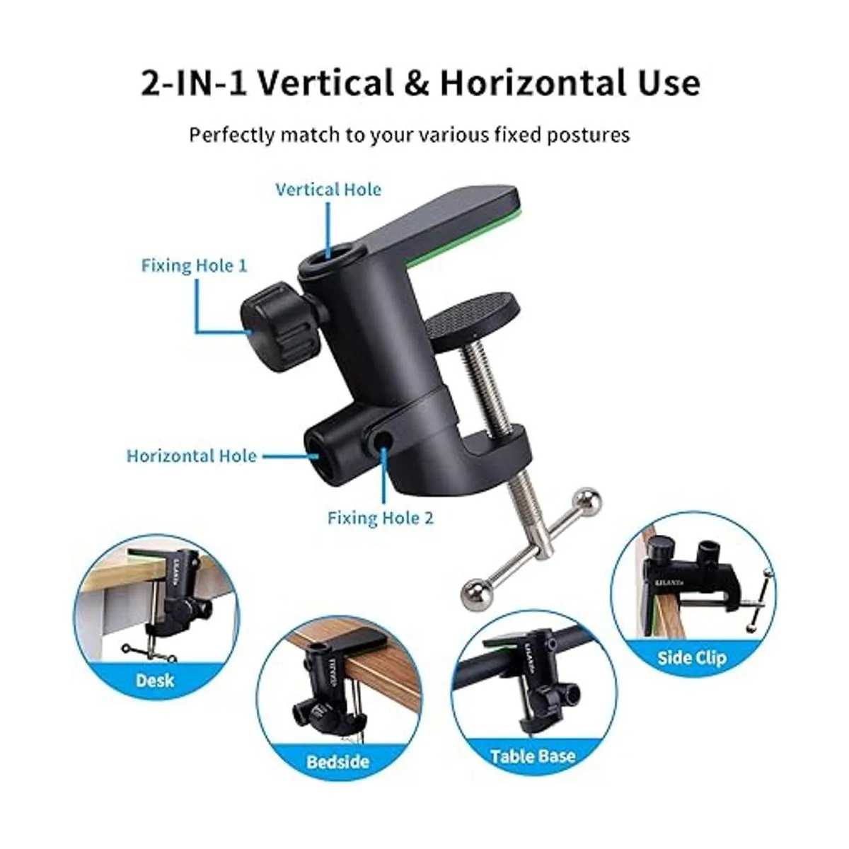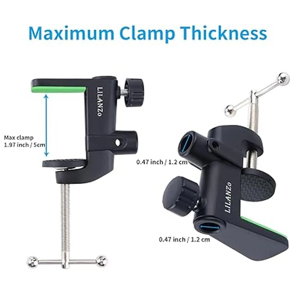 LILANZo Abrazadera de soporte de mesa 2 en 1, soporte de metal resistente para micrófono de suspensión de micrófono, soporte de brazo de tijera y soporte de soporte de teléfono superior, se adapta a hasta 1.97 pulgadas de grosor de escritorio