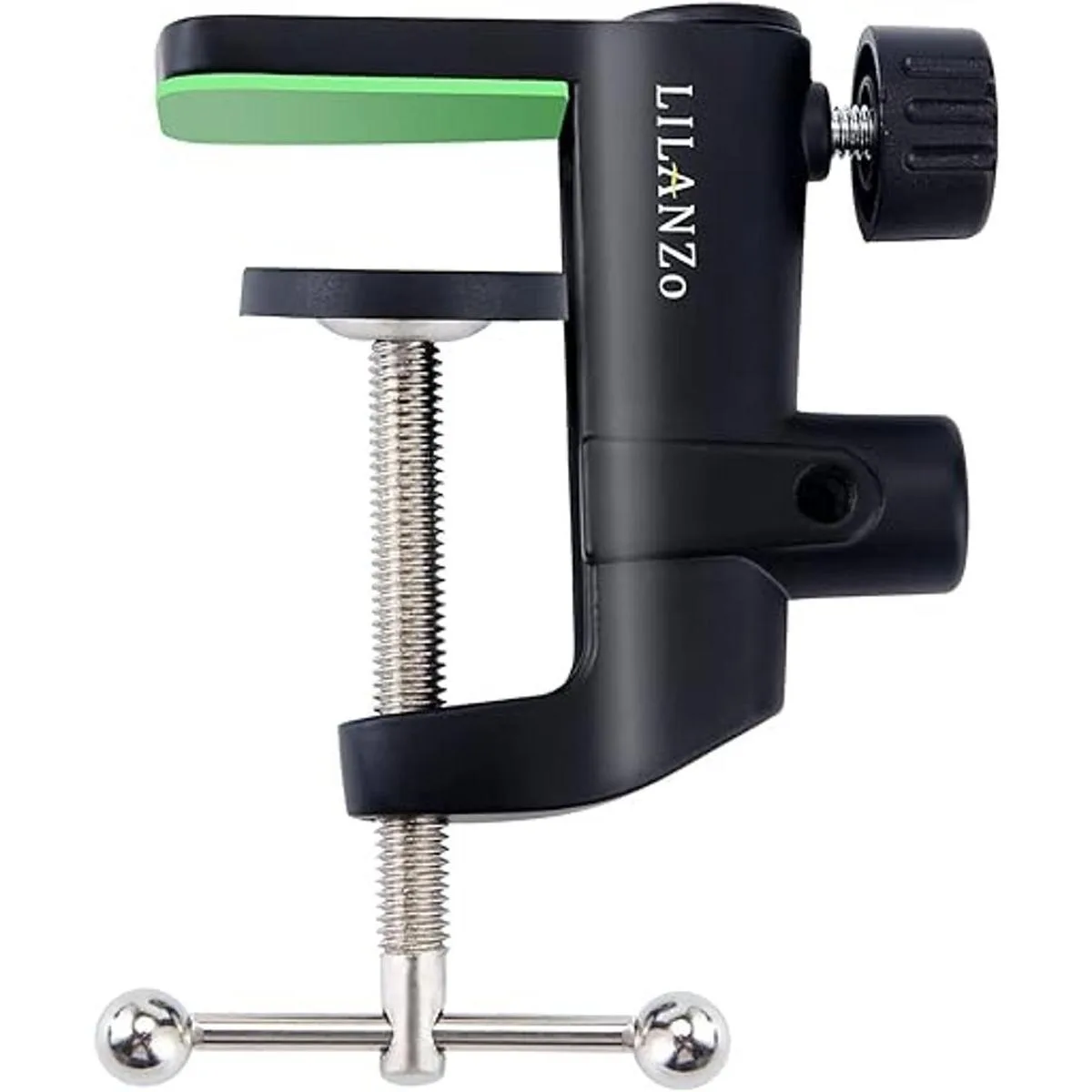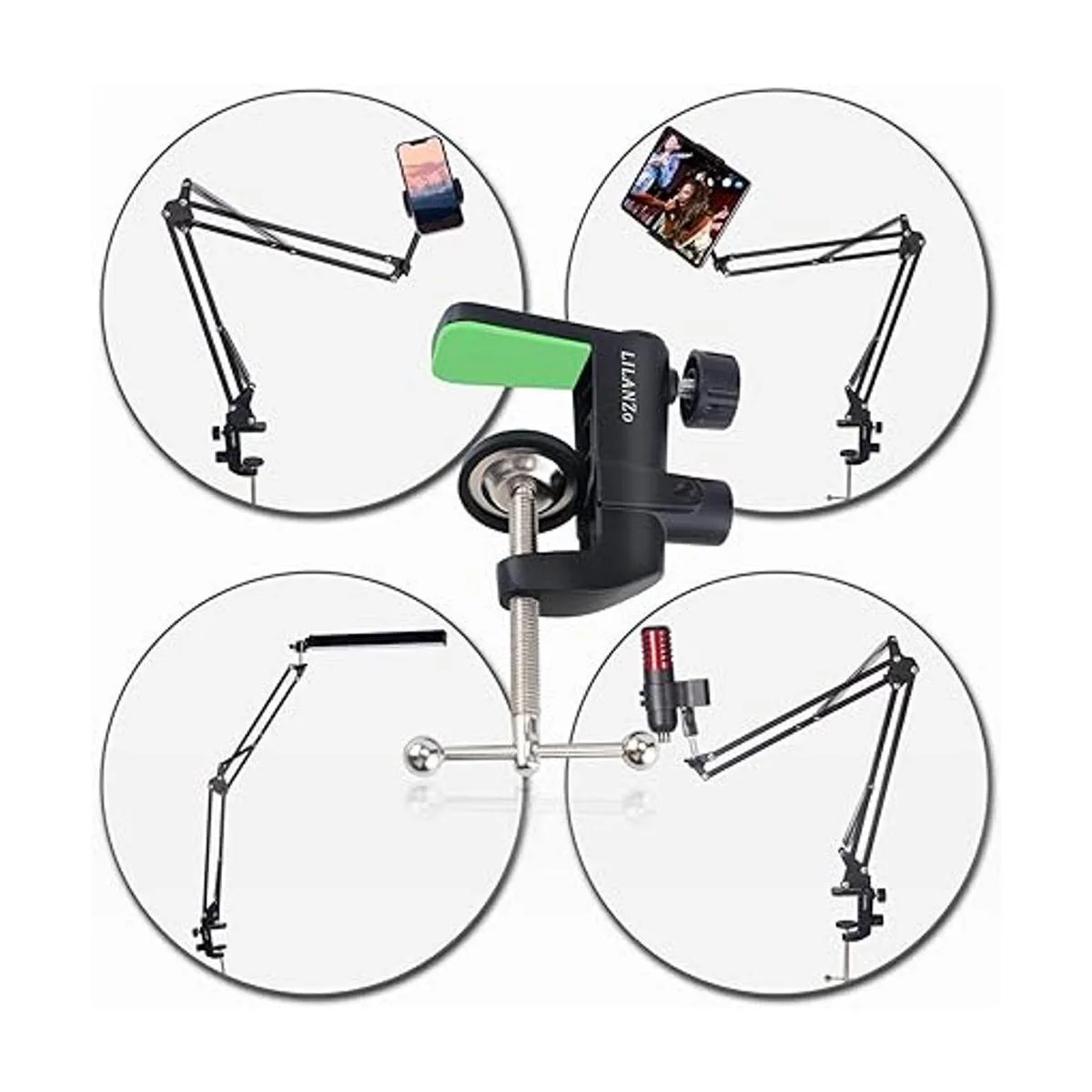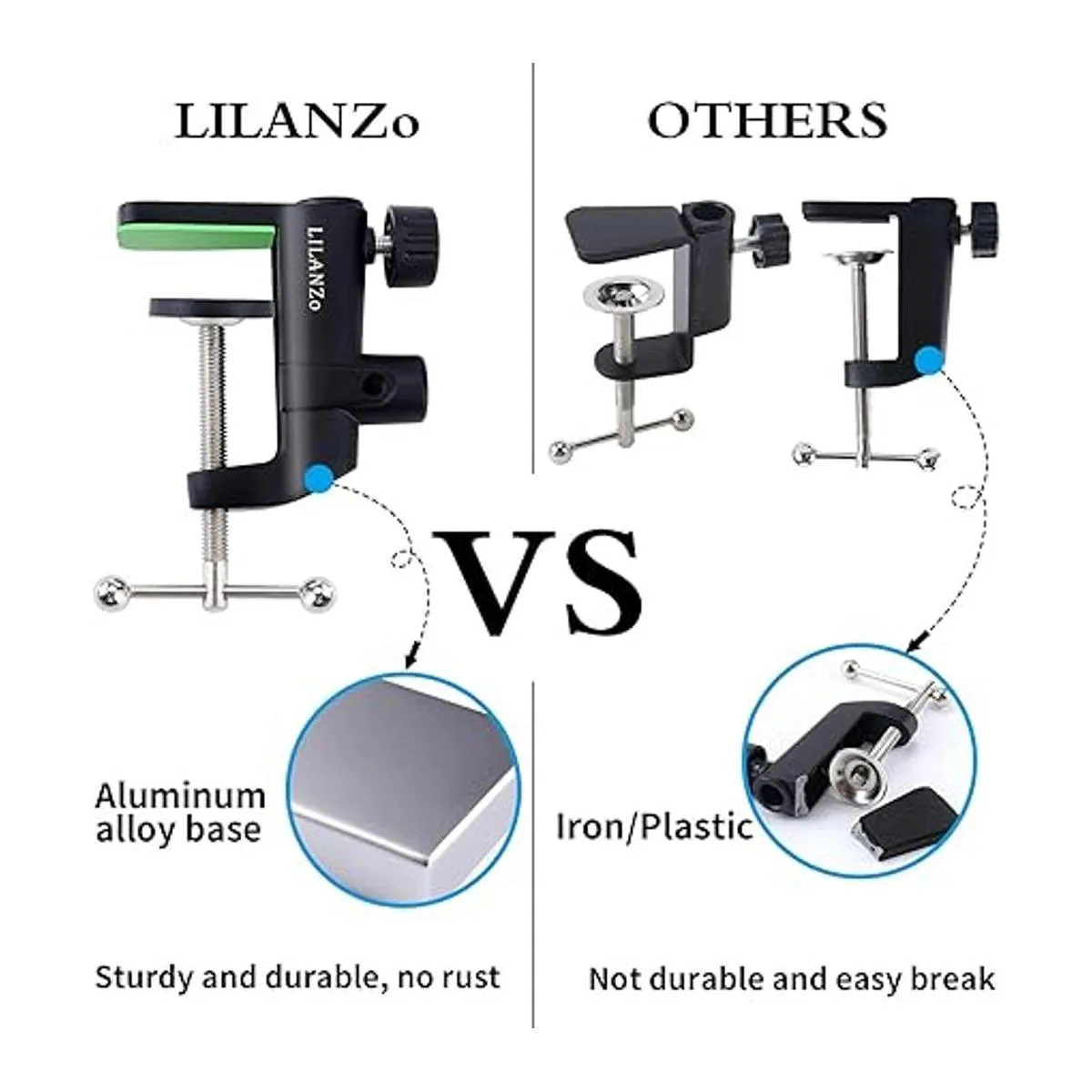 LILANZo Abrazadera de soporte de mesa 2 en 1, soporte de metal resistente para micrófono de suspensión de micrófono, soporte de brazo de tijera y soporte de soporte de teléfono superior, se adapta a hasta 1.97 pulgadas de grosor de escritorio
