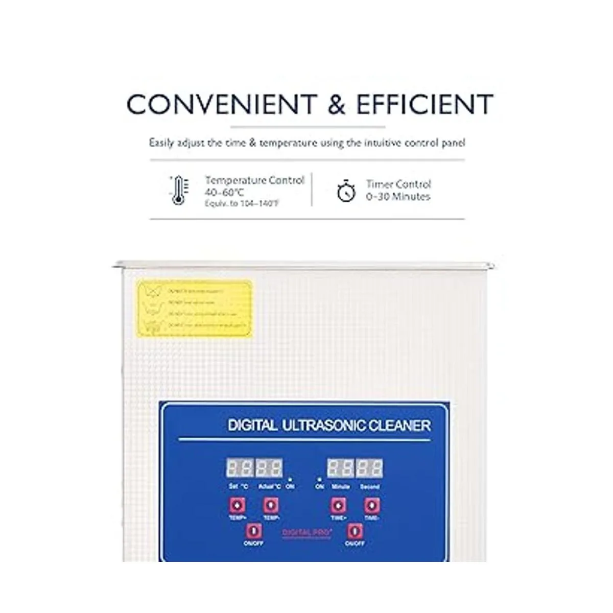 Fácil de usar: llena el tanque con agua y cualquier limpiador necesario, coloca tus artículos en la cesta, ajusta la temperatura entre 68 y 140 F y el temporizador de 1 a 30 minutos en el intuitivo panel de control digital y pulsa el botón de encendido; la cavitación de 40 kHz de este limpiador ultrasónico portátil comenzará y tu objeto estará limpio en minutos