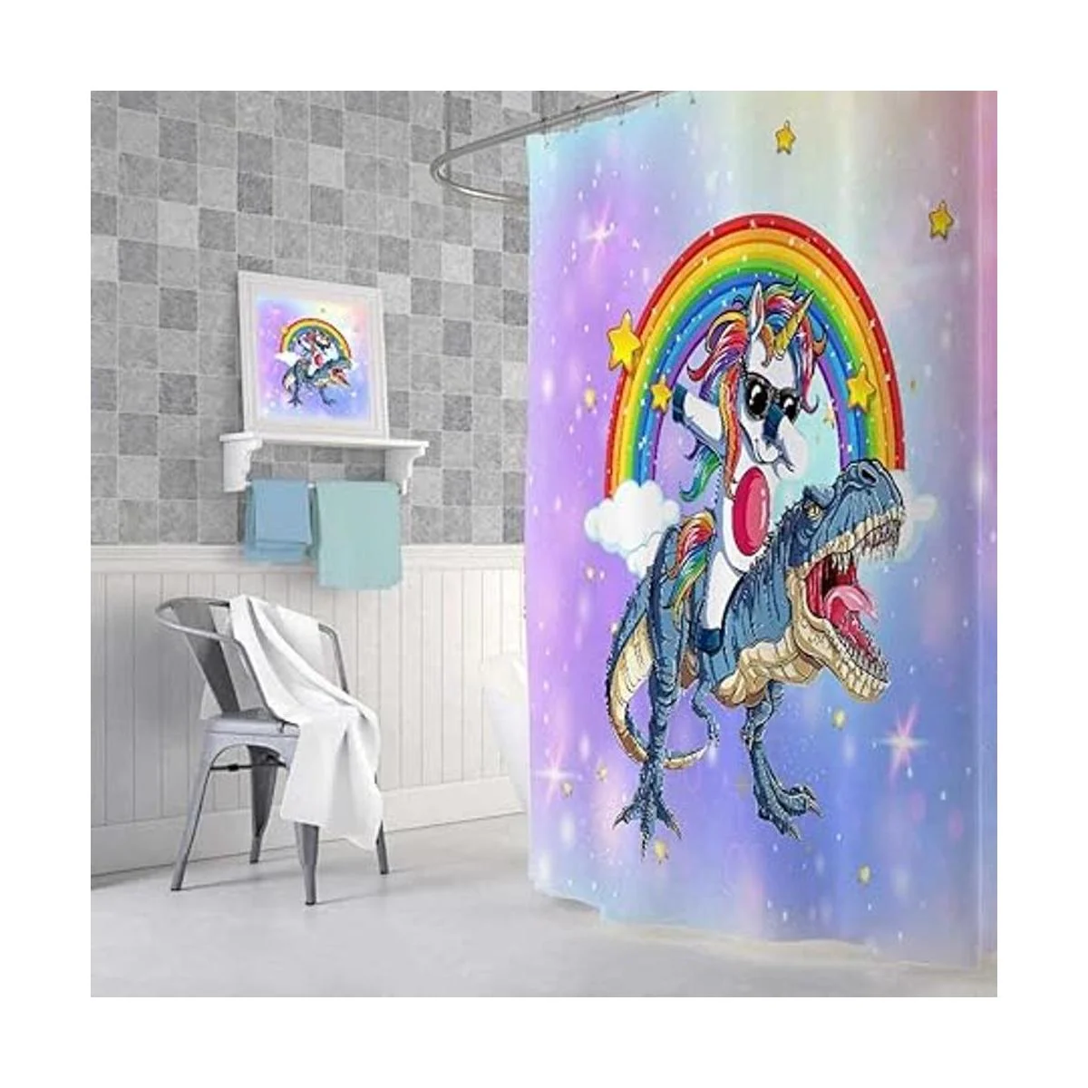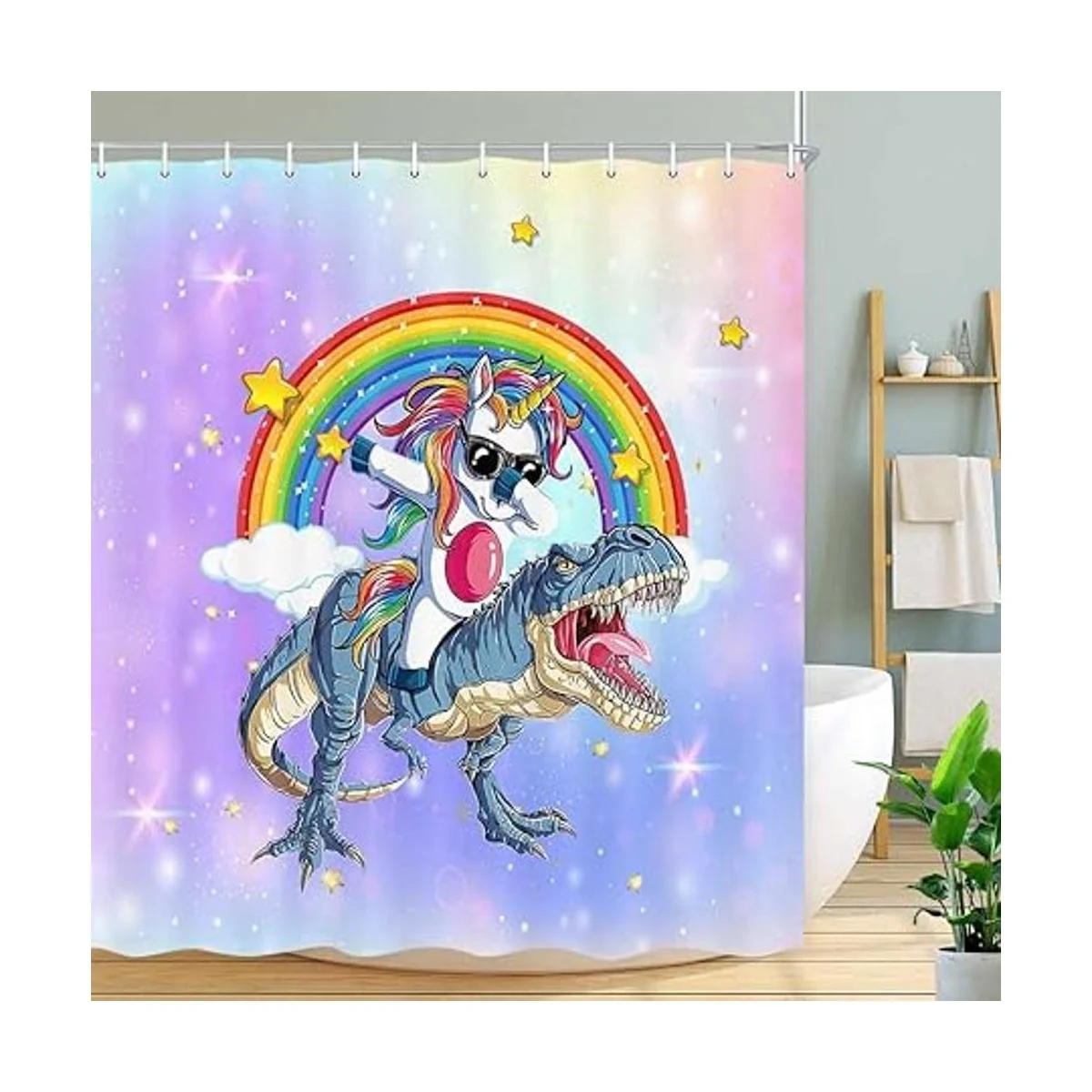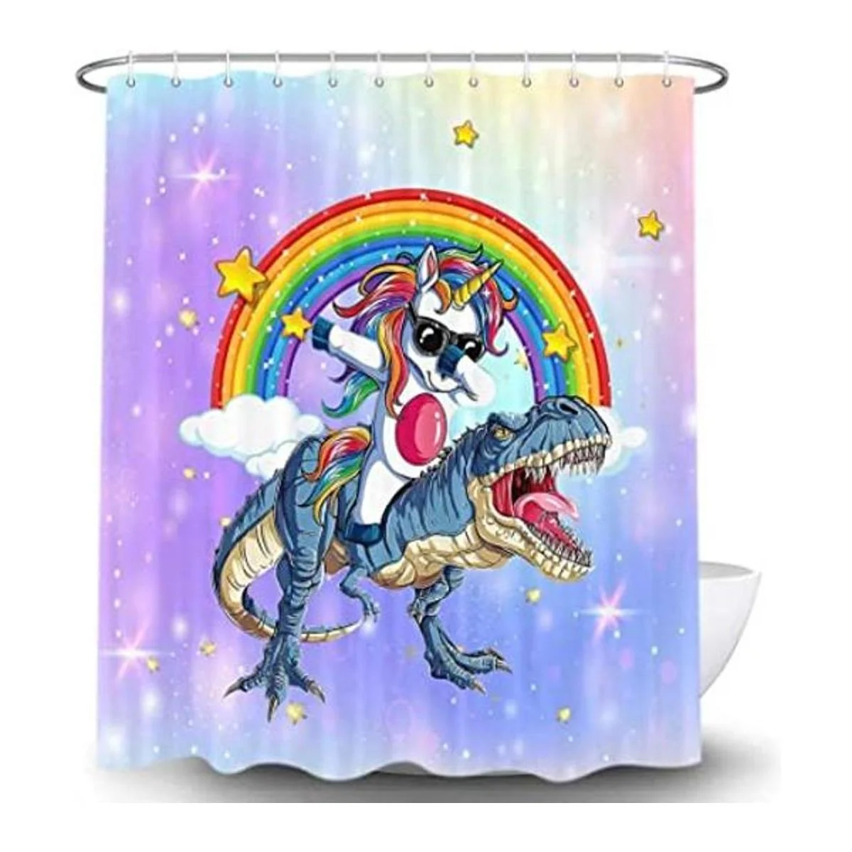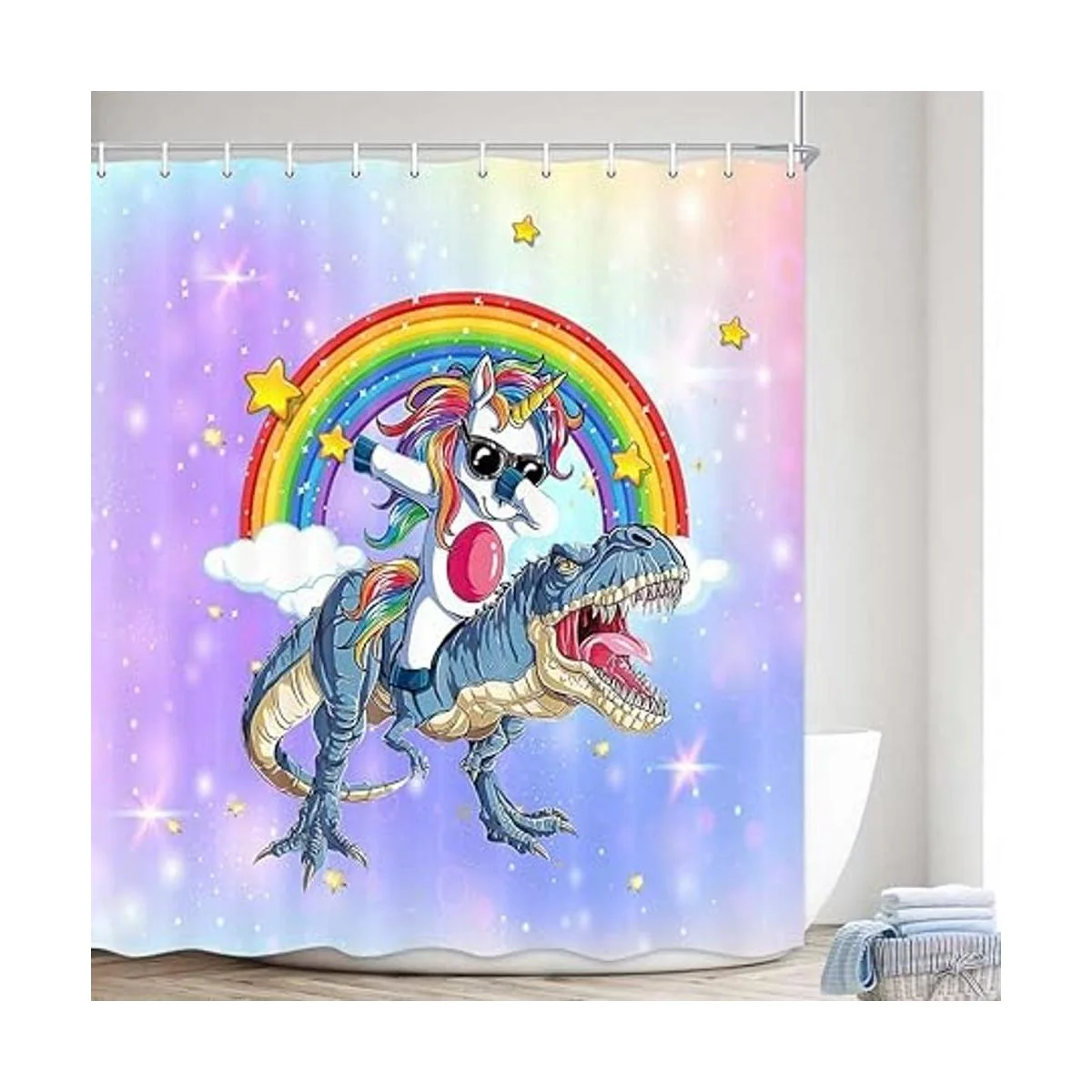 Linda cortina de ducha de dinosaurio de equitación de unicornio para el baño de niños, divertido juego de cortinas de ducha de tela espacial de dibujos animados, accesorios de decoración de baño para niños y niñas, con ganchos de 72 x 72 pulgadas