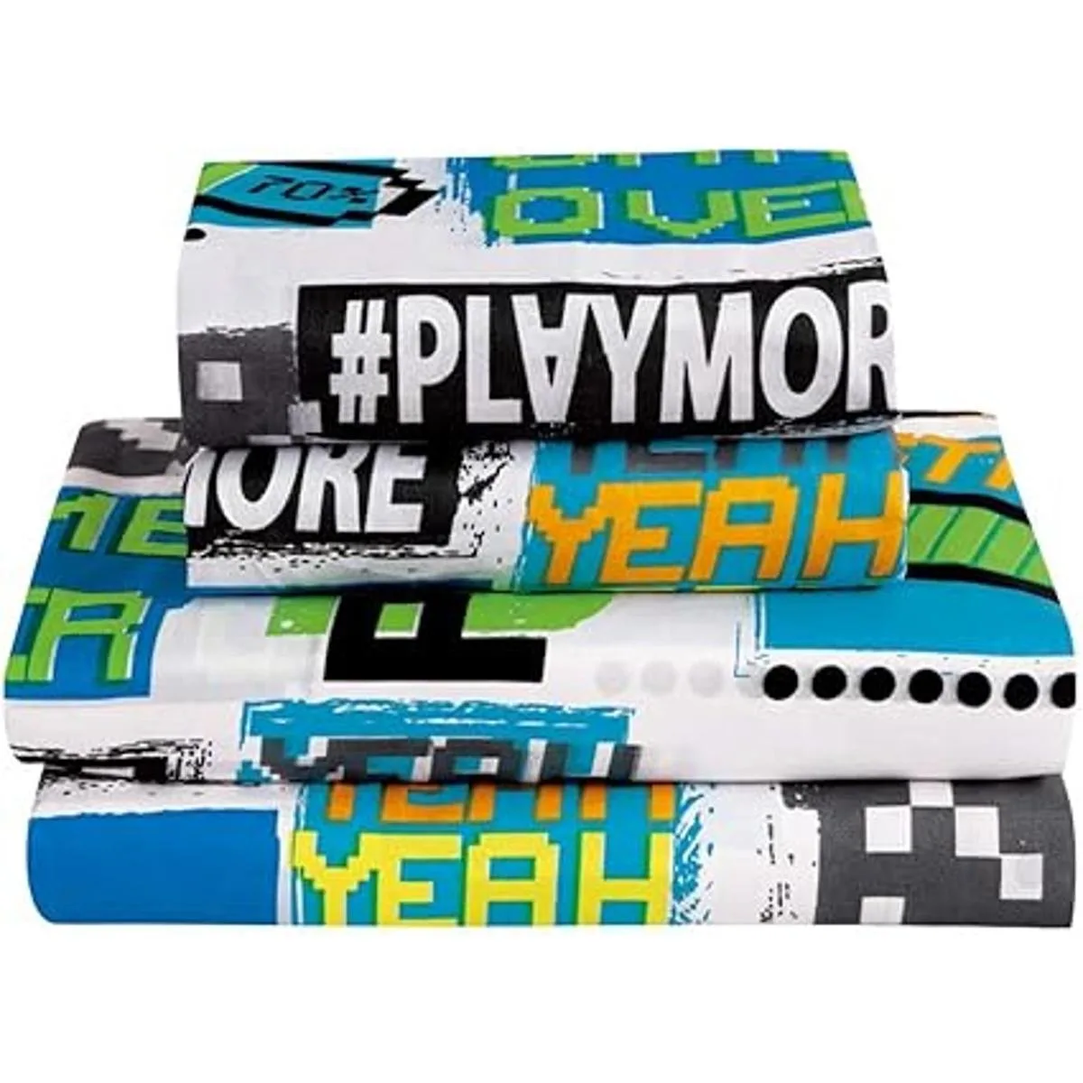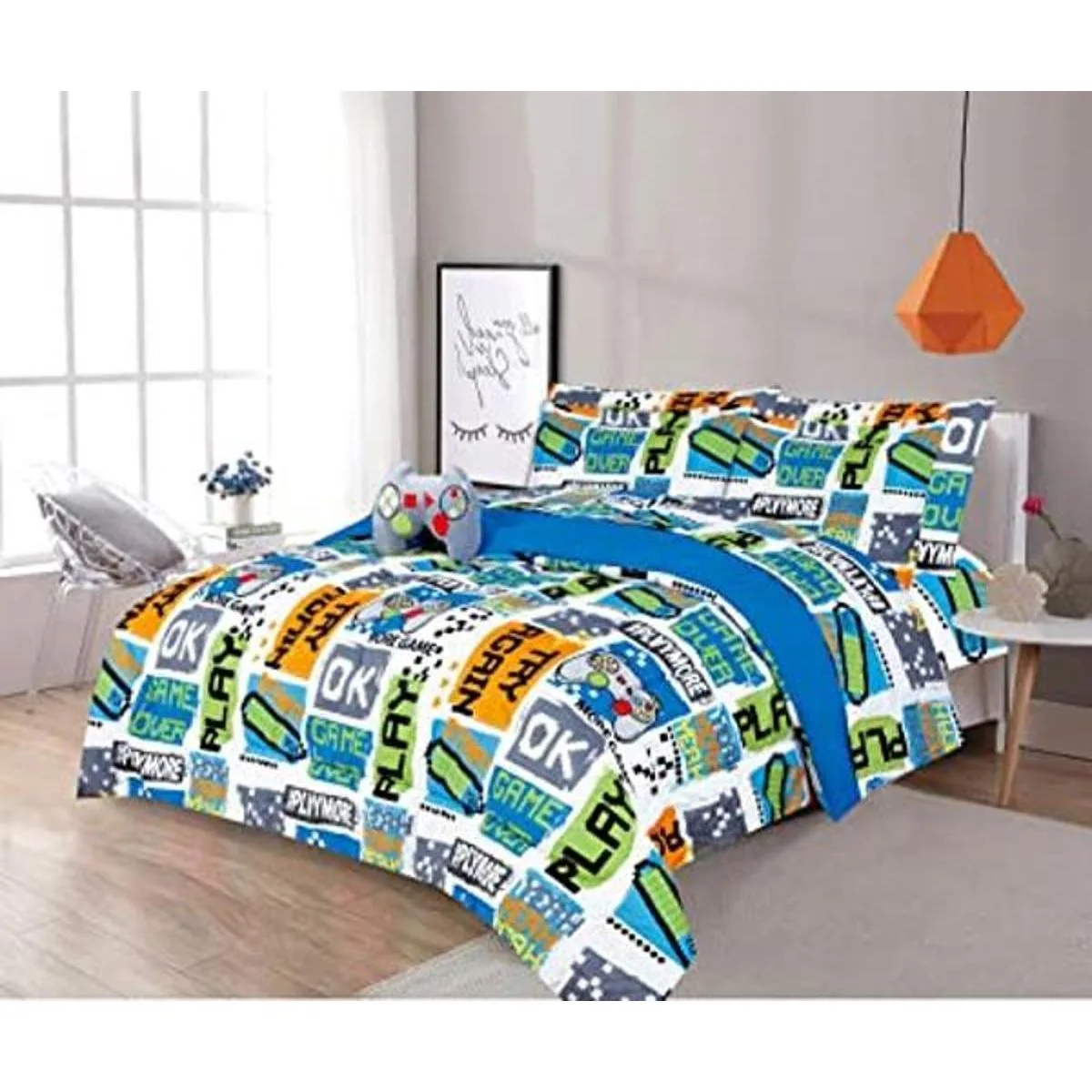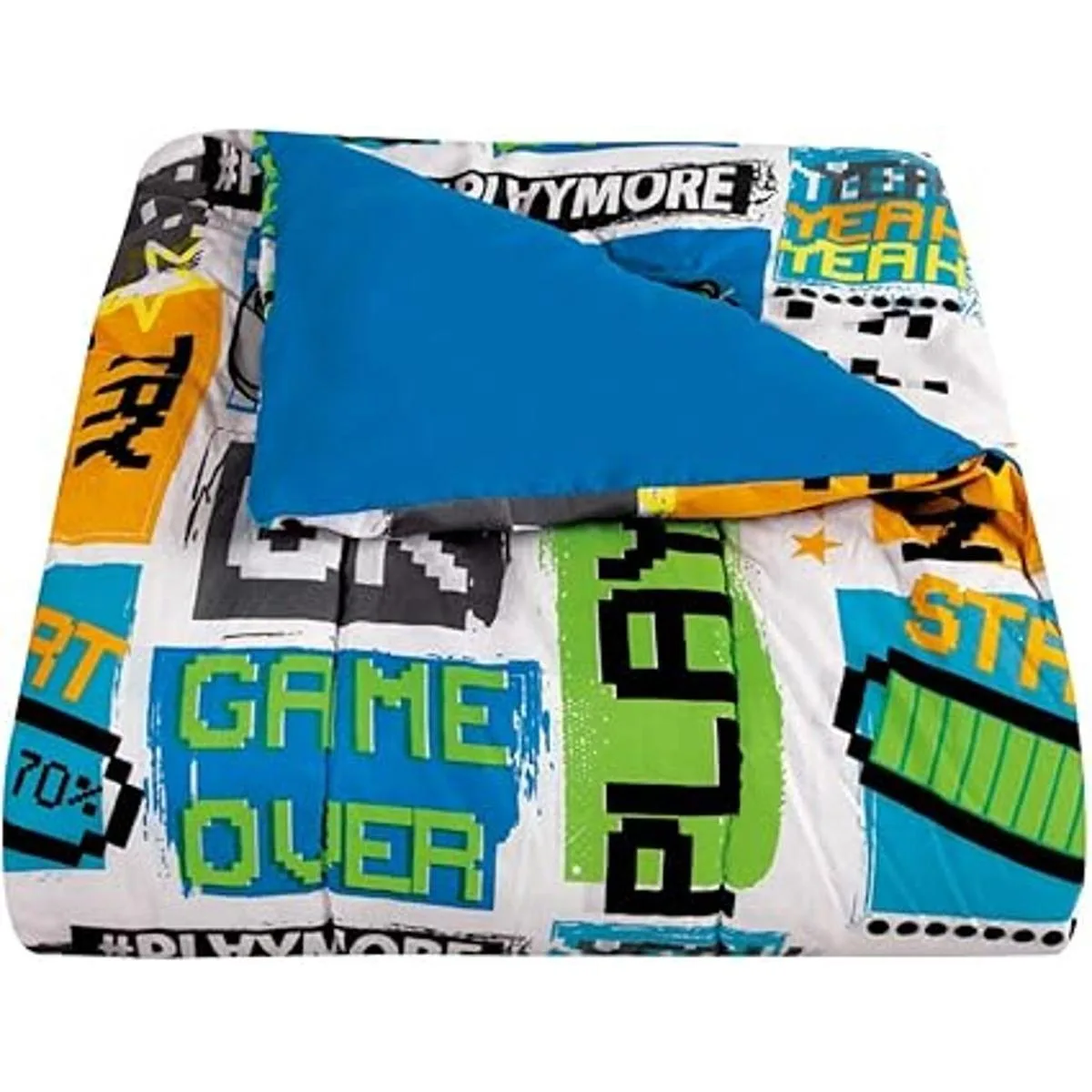LinenTopia Juego de edredón de 8 piezas de tamaño matrimonial para niños y adolescentes, cama en bolsa, fundas, juego de sábanas y almohada decorativa de juguete, edredón para niños con sábanas, videojuegos, azulverde F, 8 piezas, juego