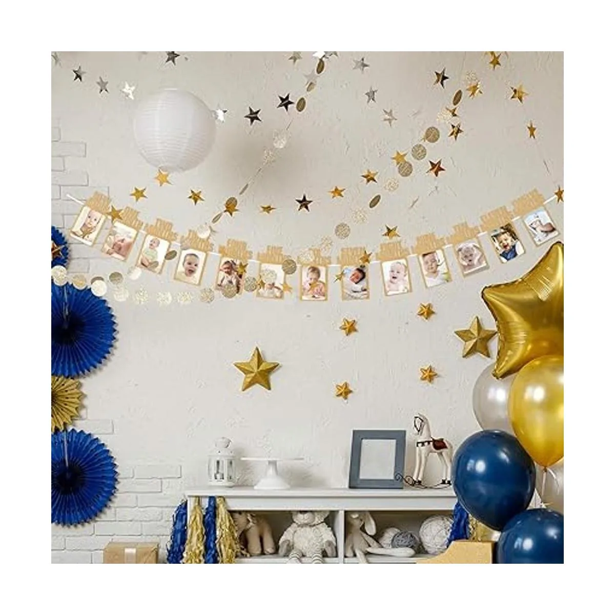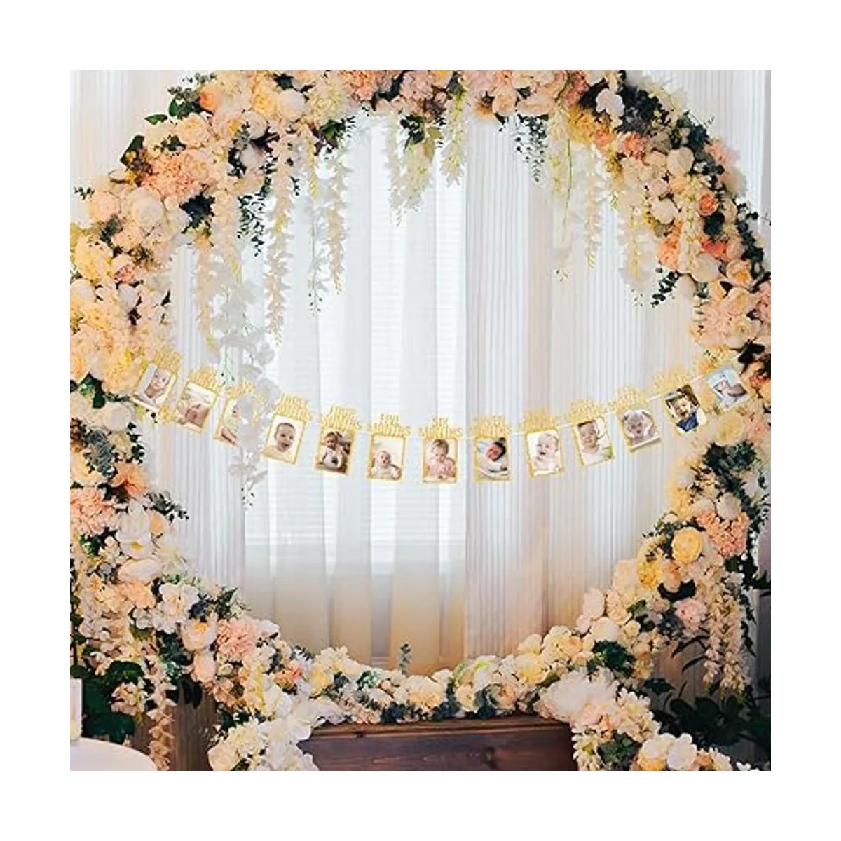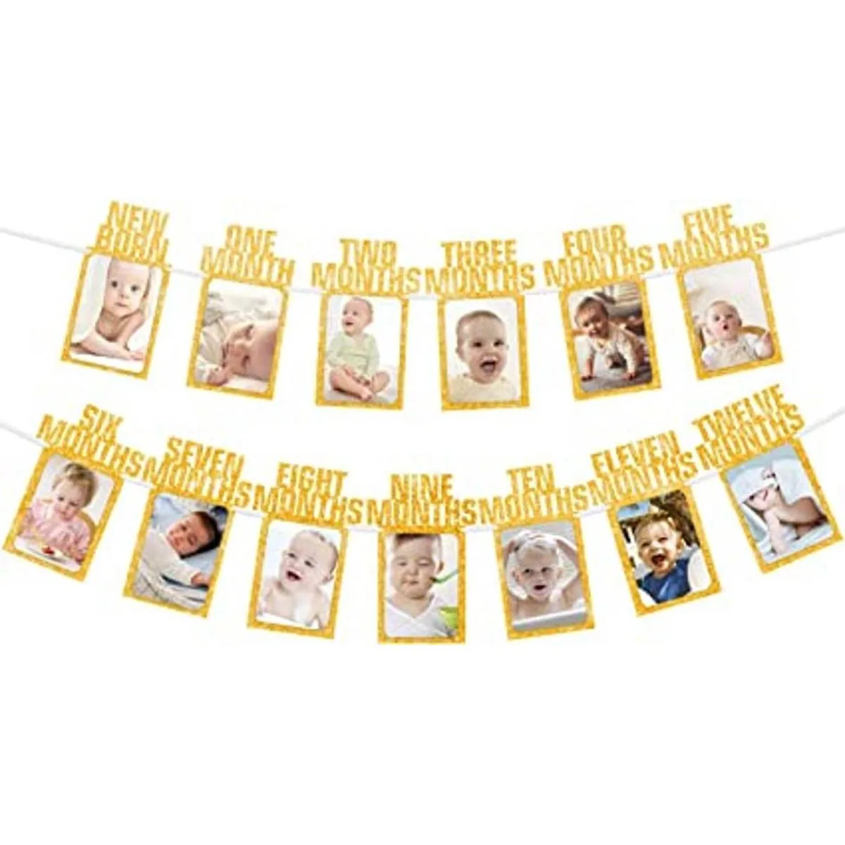 LINGPAR Banner de fotos de primer cumpleaños para bebé, perfecto para 1 12 meses, guirnalda de papel para decoración de fiesta de baby shower, color dorado con purpurina