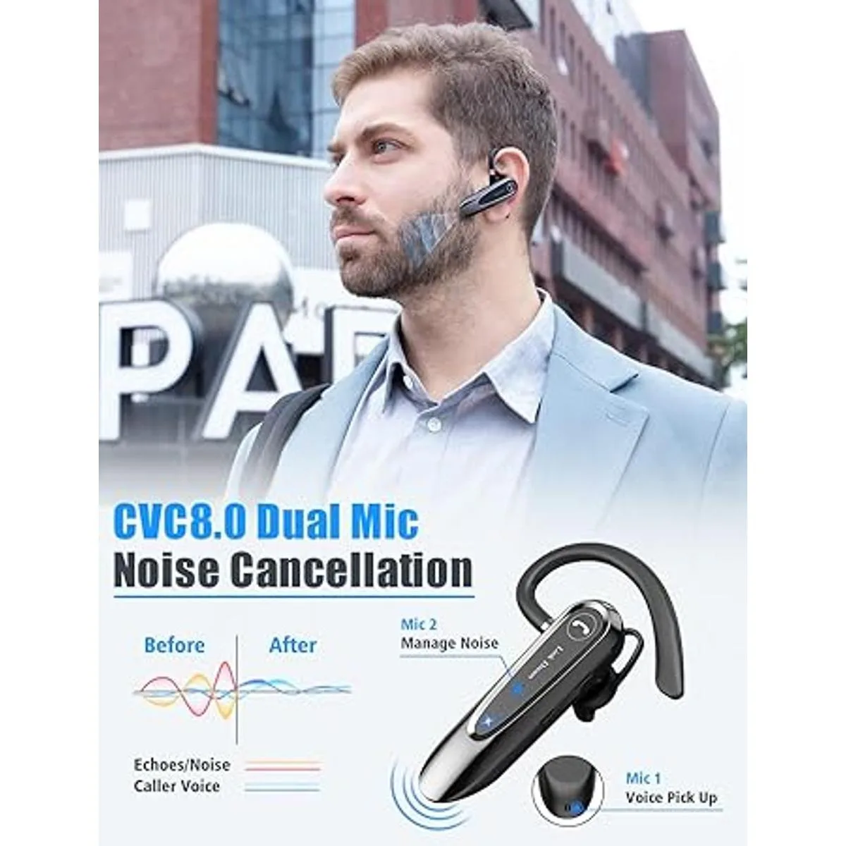 Ajuste cómodo durante todo el día: nuestro auricular Bluetooth tiene un diseño ergonómico ligero de 0.46 oz, se adapta tanto a tu luz como a la oreja derecha, y se mantiene firmemente con gancho desmontable, lo suficientemente cómodo para horas de trabajo o reproducción de música cuando trabajas en casa, oficina o conducción.
