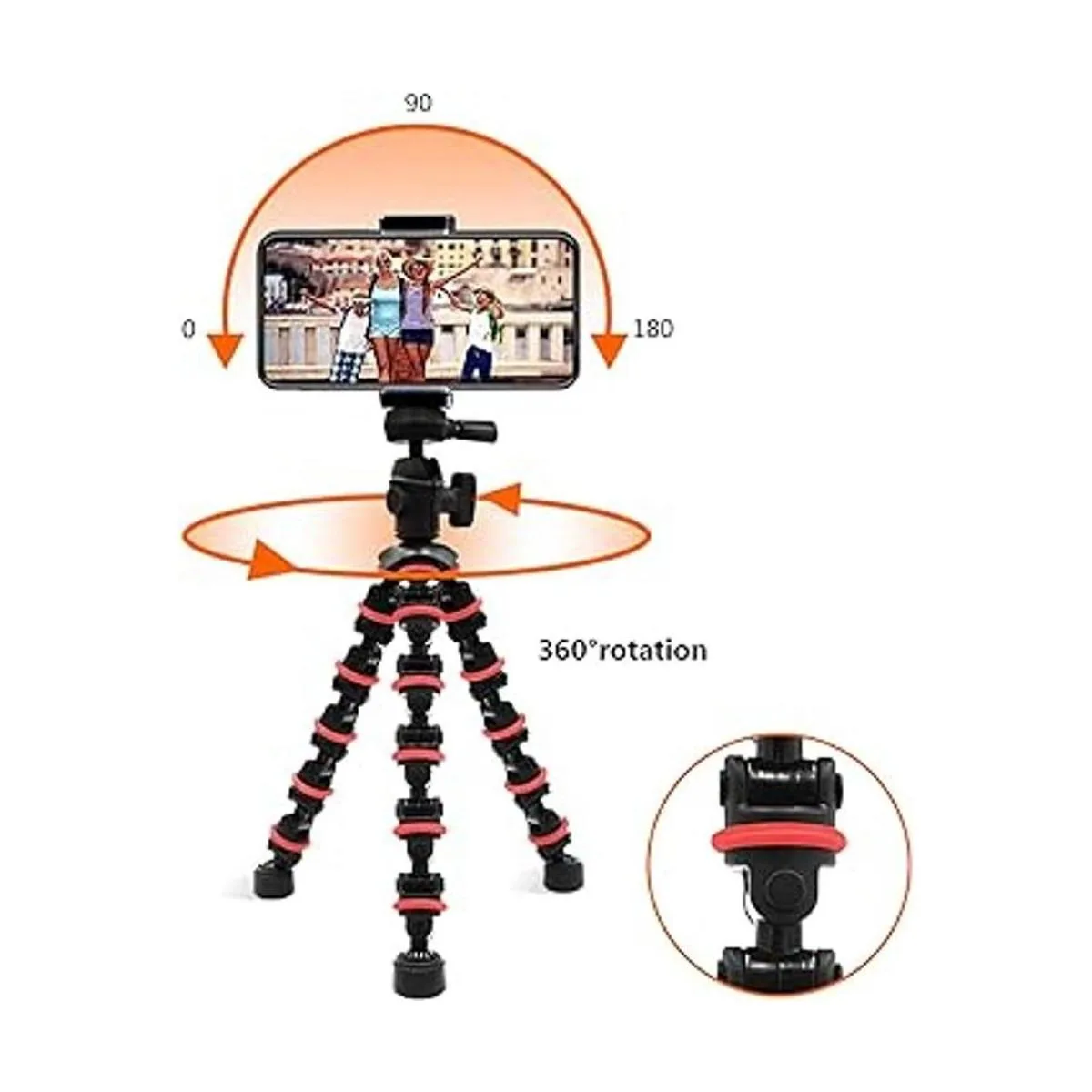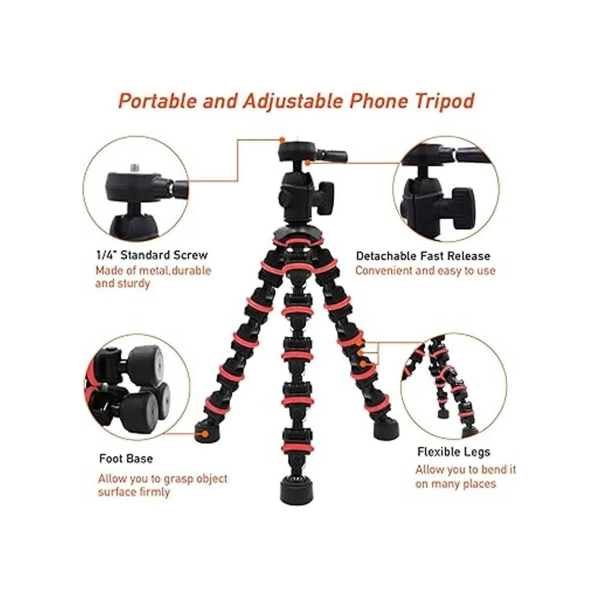 Patas flexibles mejoradas de plástico de alta calidad: el trípode permite que tu teléfono se monte en un escritorio plano o superficie irregular, por lo que es la mejor opción para grabar momentos maravillosos. El diseño de las patas OCTOPUS se puede girar en cualquier forma, envolverlo en árbol, bicicleta, lámpara, silla.