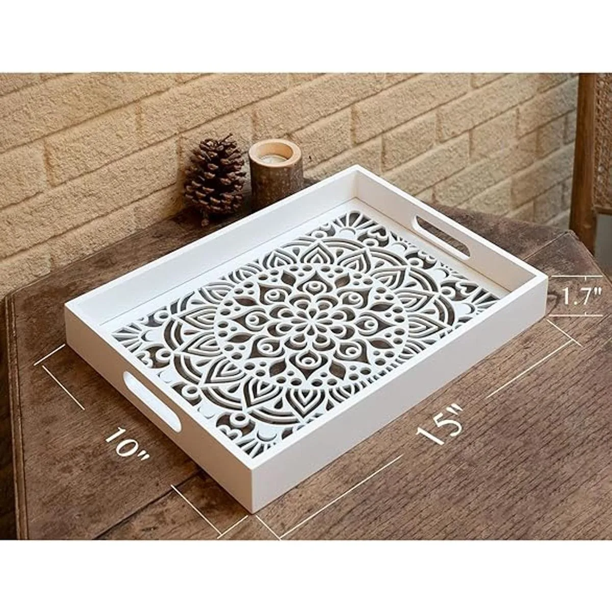 LINKOVE Bandeja de madera para servir con asas, bandeja otomana de madera blanca para sala de estar, bandeja decorativa para mesa de café, encimera de cocina, bandeja de perfume de vela para dormitorio, baño, 15 x 10 pulgadas