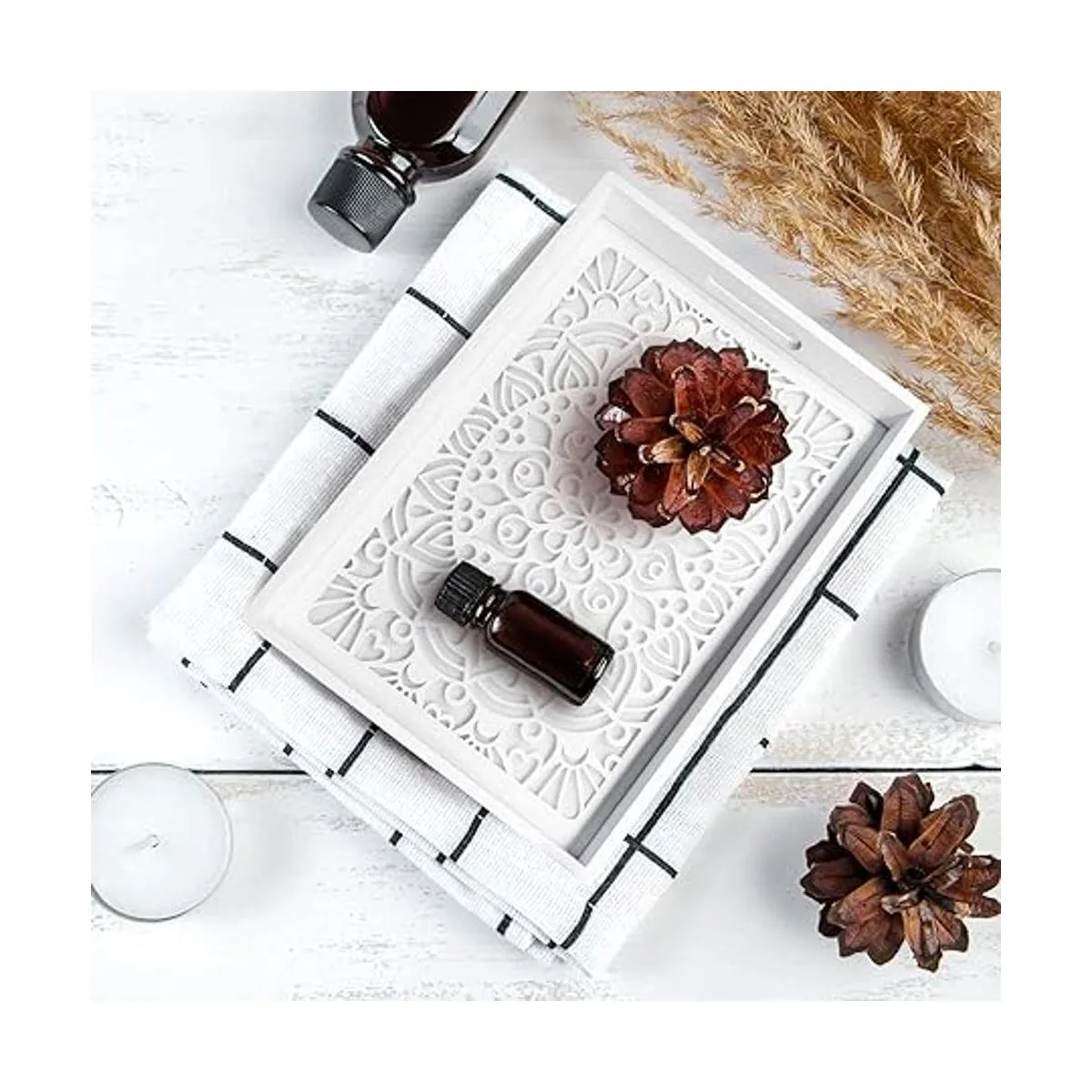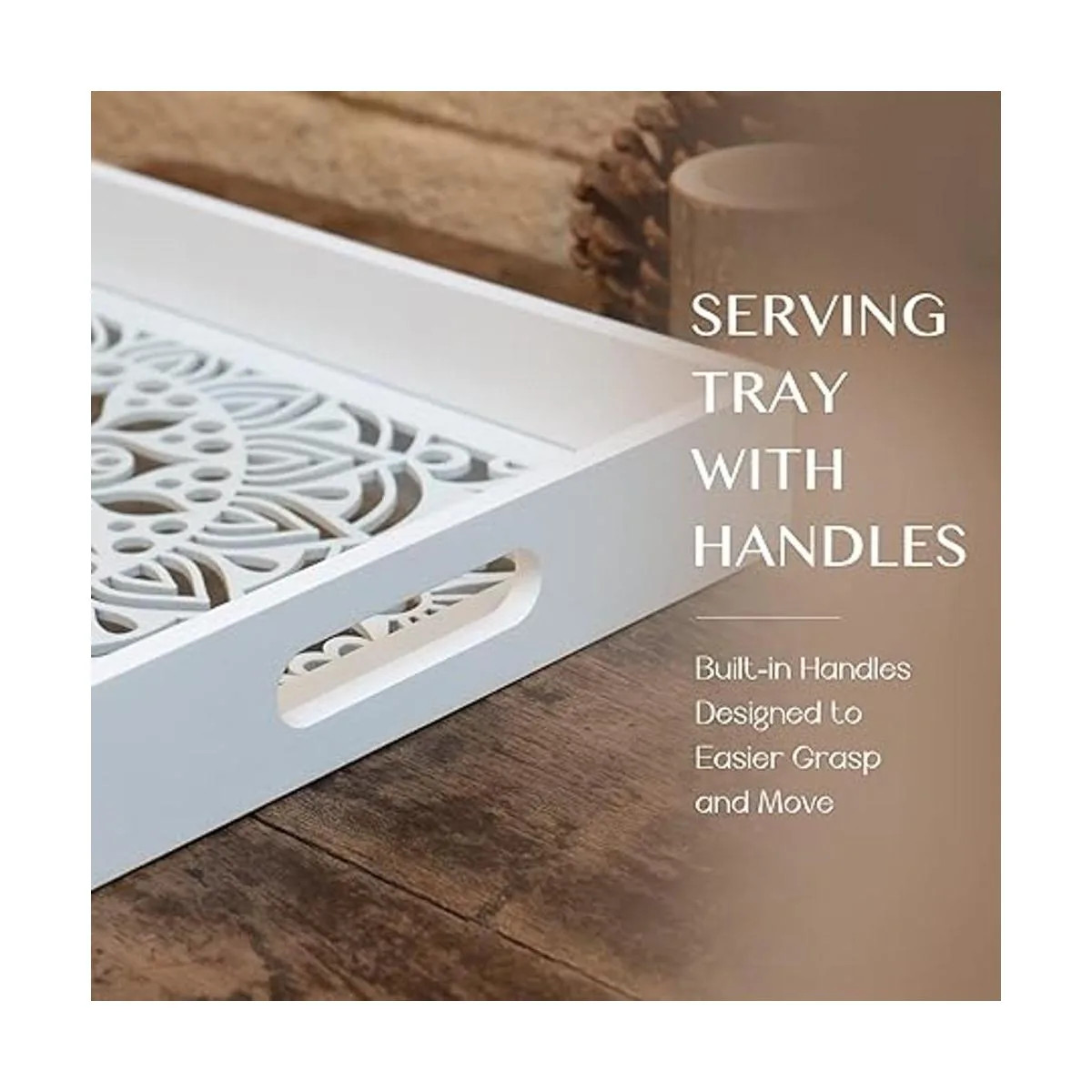 Decoración única para el hogar Esta bandeja de madera para servir se puede utilizar como una bandeja decorativa, una bandeja otomana para sala de estar, bandejas de baño para encimera, una bandeja de tocador y perfume para dormitorio, bandeja de mesa de café, decoración de mesa y mucho más. Aporta un toque decorativo elegante y glamuroso a tu hogar con esta deslumbrante bandeja.