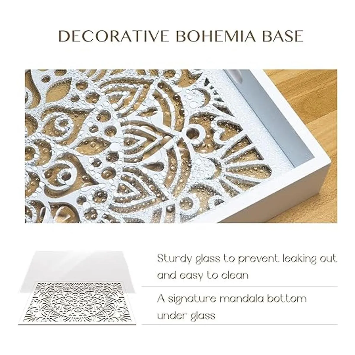 Bandeja decorativa Esta bandeja de madera destaca por todas las razones correctas, con un cristal transparente en la parte inferior bohemia. Utilízalo para crear un elegante centro de mesa, y almacenar y mostrar las necesidades del hogar. Está disponible en formas redondas y rectangulares para darte múltiples opciones para múltiples estéticas.