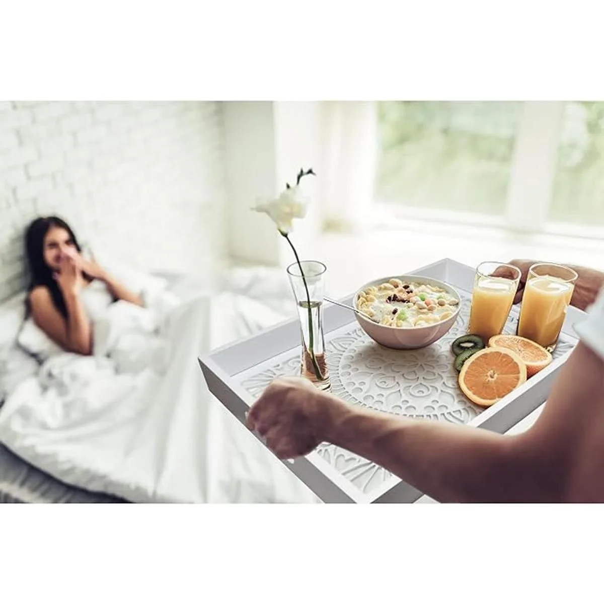 Bandeja para servir con asasas Diseñada con asas laterales, esta bandeja para servir permite una fácil movilidad de una habitación a otra. Adecuado como bandejas de desayuno o cena para café, té, postre, pan, pastel y mucho más