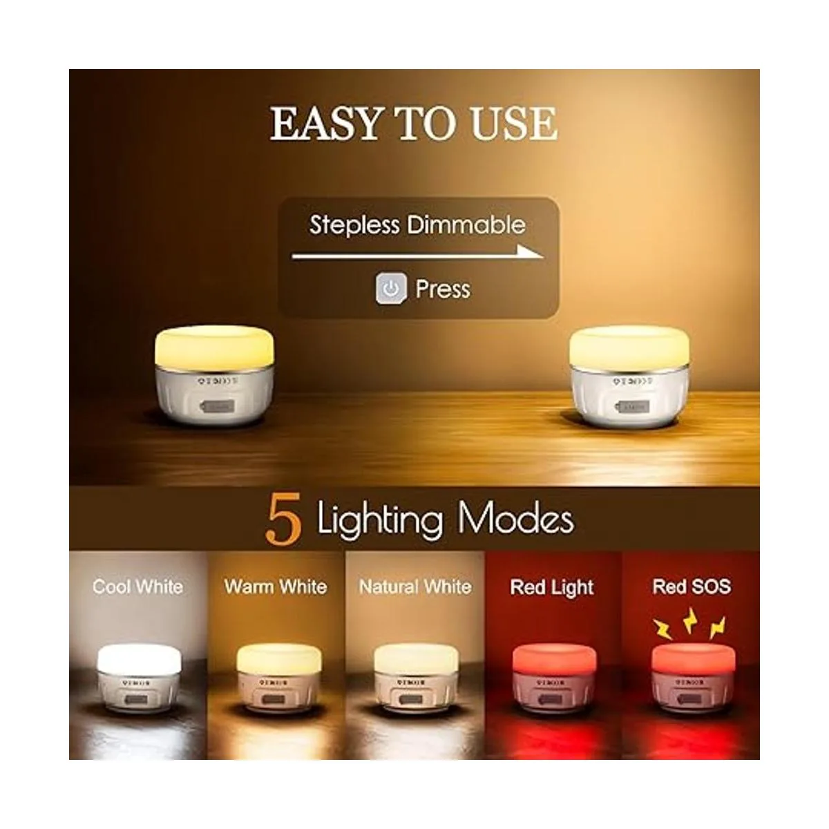 Ultra brillante y 5 modos de iluminación Linterna LED portátil de 360 grados y 1000 lm para exteriores con cinco modos de iluminación: blanco natural, blanco cálido, blanco frío, luz roja siempre encendida, rojo SOS, iluminación de hasta 8150 horas respectivamente. Uso continuo mientras estás en emergencia, huracán, corte de energía. Ideal como linterna de camping de emergencia o kit de supervivencia cuando acampas.