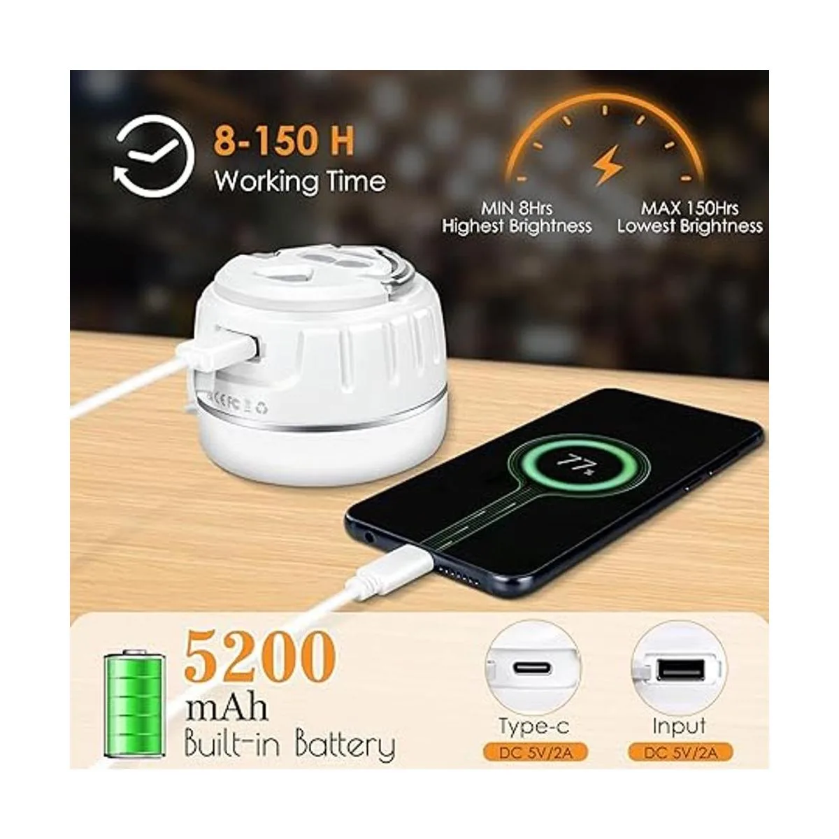 Banco de energía de 5200 mAh: linternas de camping recargables por USB incorporadas con batería recargable de 5200 mAh cable USB de alta calidad incluido, longitud del cable: 3.3 ft, con un puerto USB de carga rápida de 5 V y 2 A, carga tus teléfonos, iPad cómodamente cuando sea necesario. Compatible con adaptador de cargador de 5 V CC no incluido.