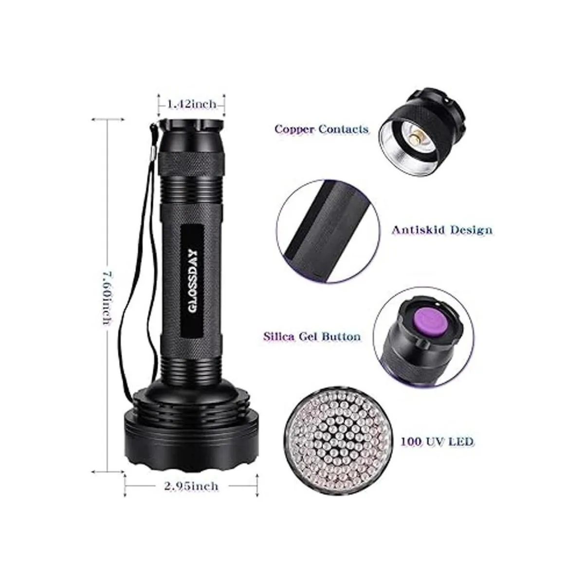 Linterna UV extrema: la linterna de luz negra de grado profesional está hecha de aluminio de grado aeronáutico y LED de ultra intensidad con tratamiento de superficie antiabrasivo, agarre texturizado antideslizante. Diseñada y producida por GLOSSDAY, la linterna ultravioleta extrema apunta a una mejor experiencia de usuario con tiempo de iluminación de hasta 20 horas.