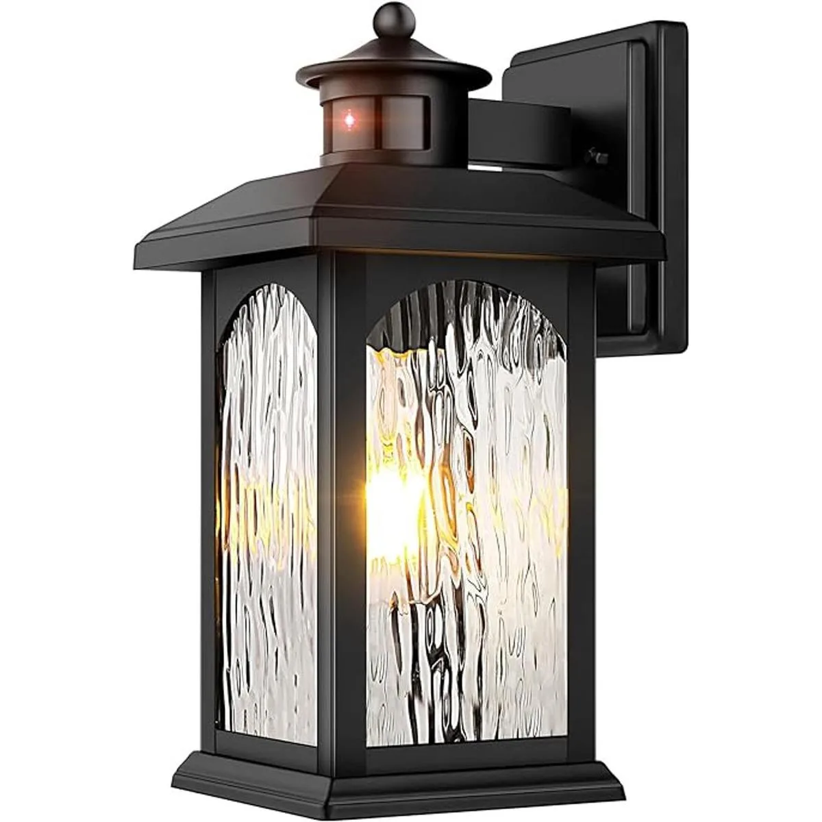 Linterna de pared para exteriores con sensor de movimiento, iluminación exterior actualizada del atardecer al amanecer, lámparas exteriores, luces negras para porche y apliques de pared exterior con vidrio ondulado de agua para patio, garaje, entrada y casa